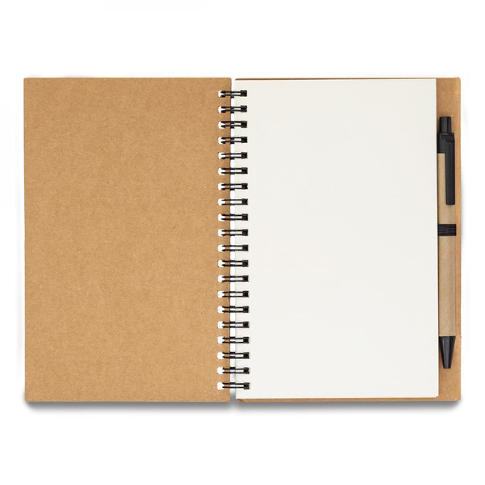 Блокнот B6 с 70 пустыми страницами (70 г/м2) с ручкой, эластичной петлей и металлической спиралью. Ручка изготовлена из переработанных материалов (синий стержень).