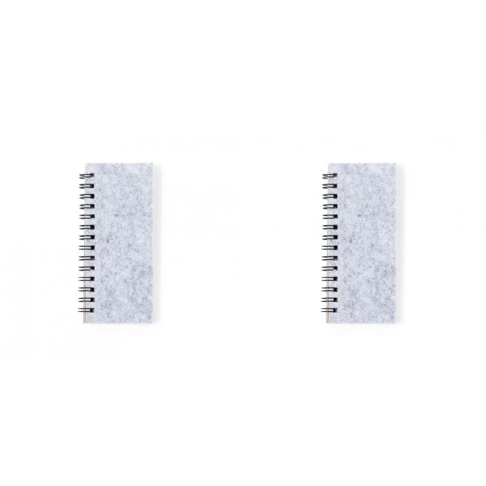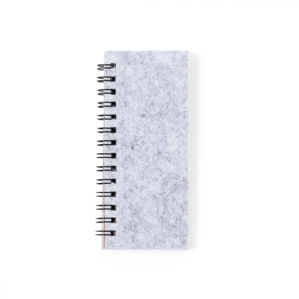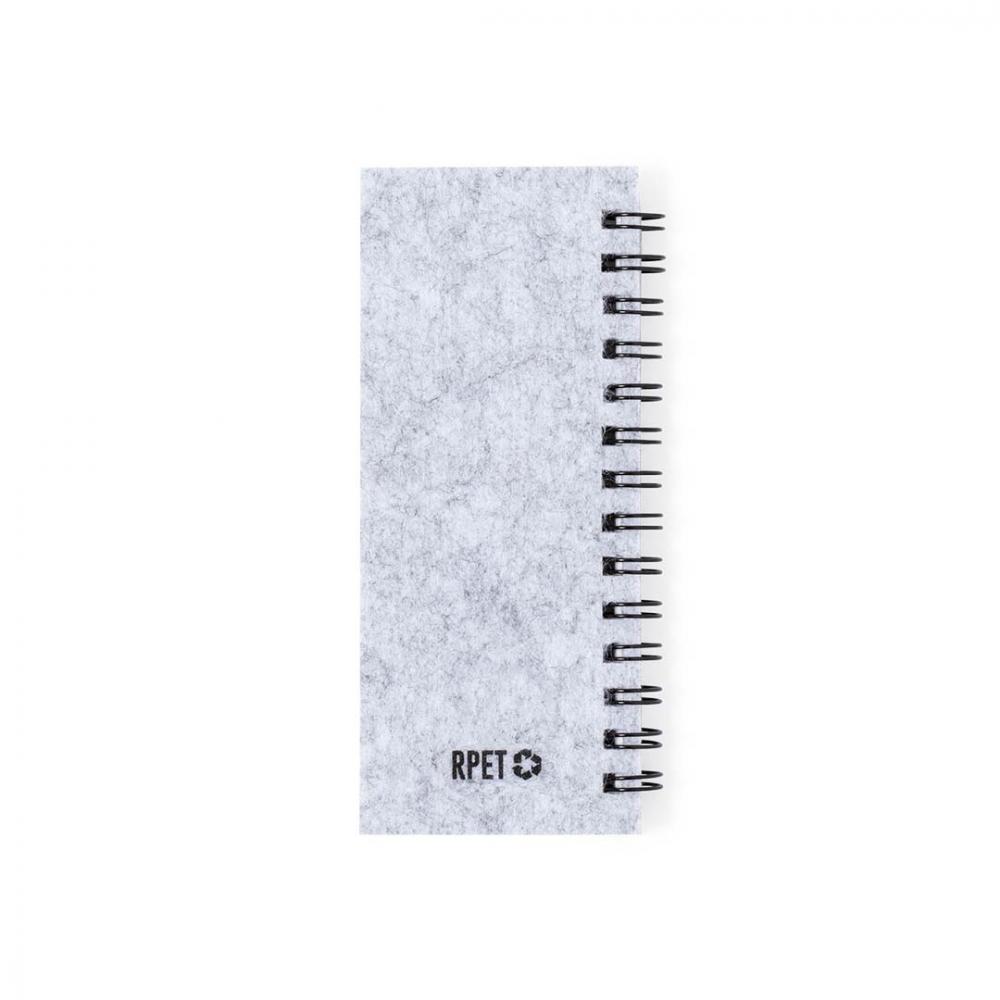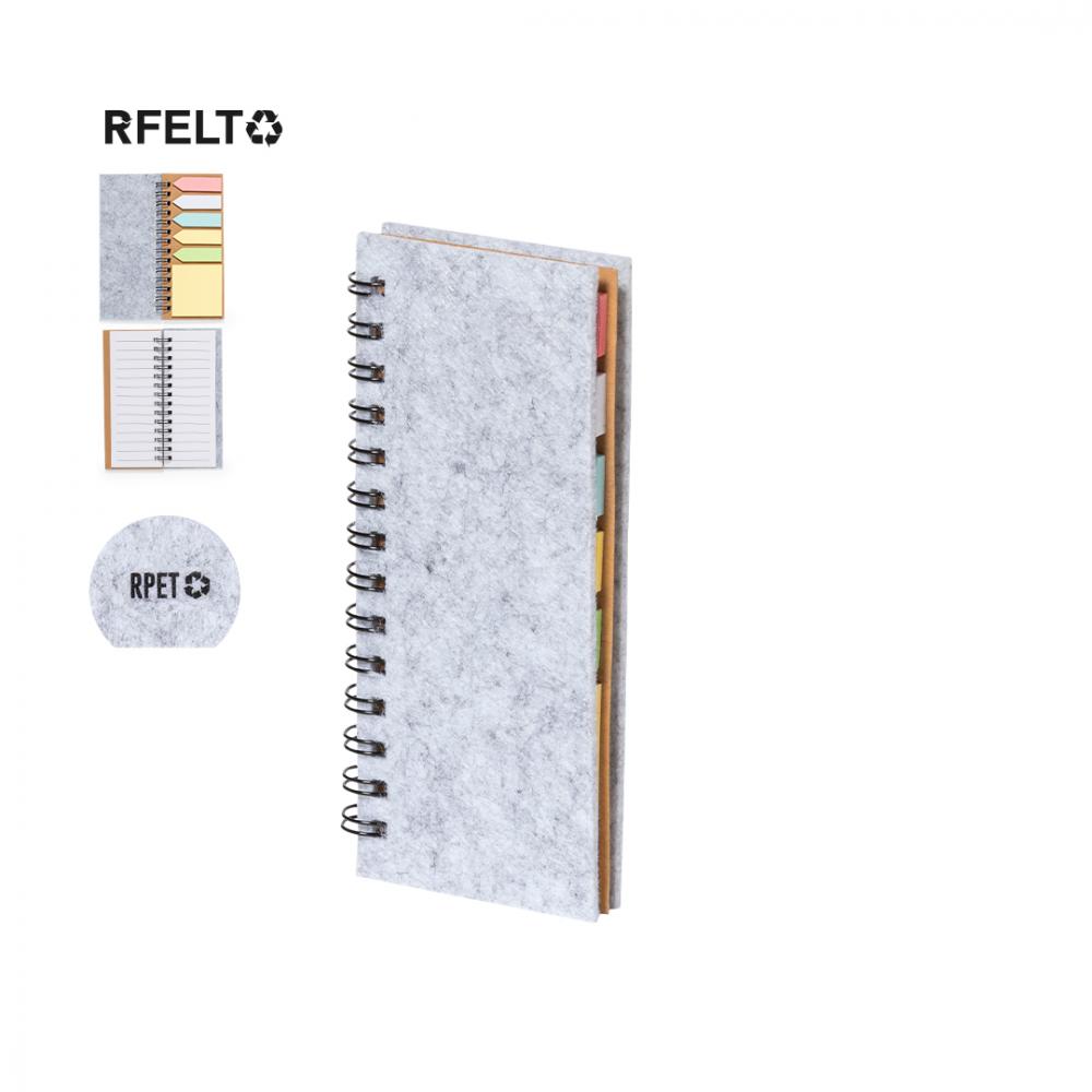 Блокнот с обложкой из мягкого фетра RPET. Включает: 30 белых листов в линейку, 25 средних самоклеящихся стикеров, 125 мини-самоклеящихся стикеров разных цветов.