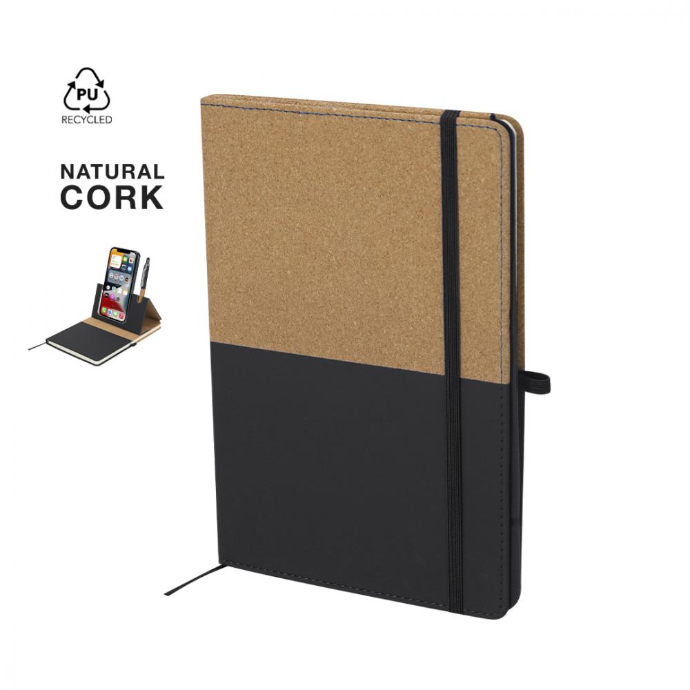 Блокнот с жесткими обложками из комбинированного переработанного ПУ и пробки, с универсальной магнитной поддержкой в крышке из пробки для мобильных устройств. Имеет эластичное закрытие, черную закладку и держатель для ручки в черном цвете. Содержит 80 внутренних листов с линованным макетом. С этикеткой из переработанного ПУ. Переработанное ПУ известно своей прочностью и эластичностью. Этот переработанный и подлежащий переработке материал является устойчивым выбором, который перерабатывает отброшенные волокна во время производственных процессов, тем самым минимизируя отходы материалов и способствуя снижению экологического воздействия, сохраняя при этом свои первоначальные свойства. Жесткая обложка. 80 листов. Переработанное ПУ/Пробка.