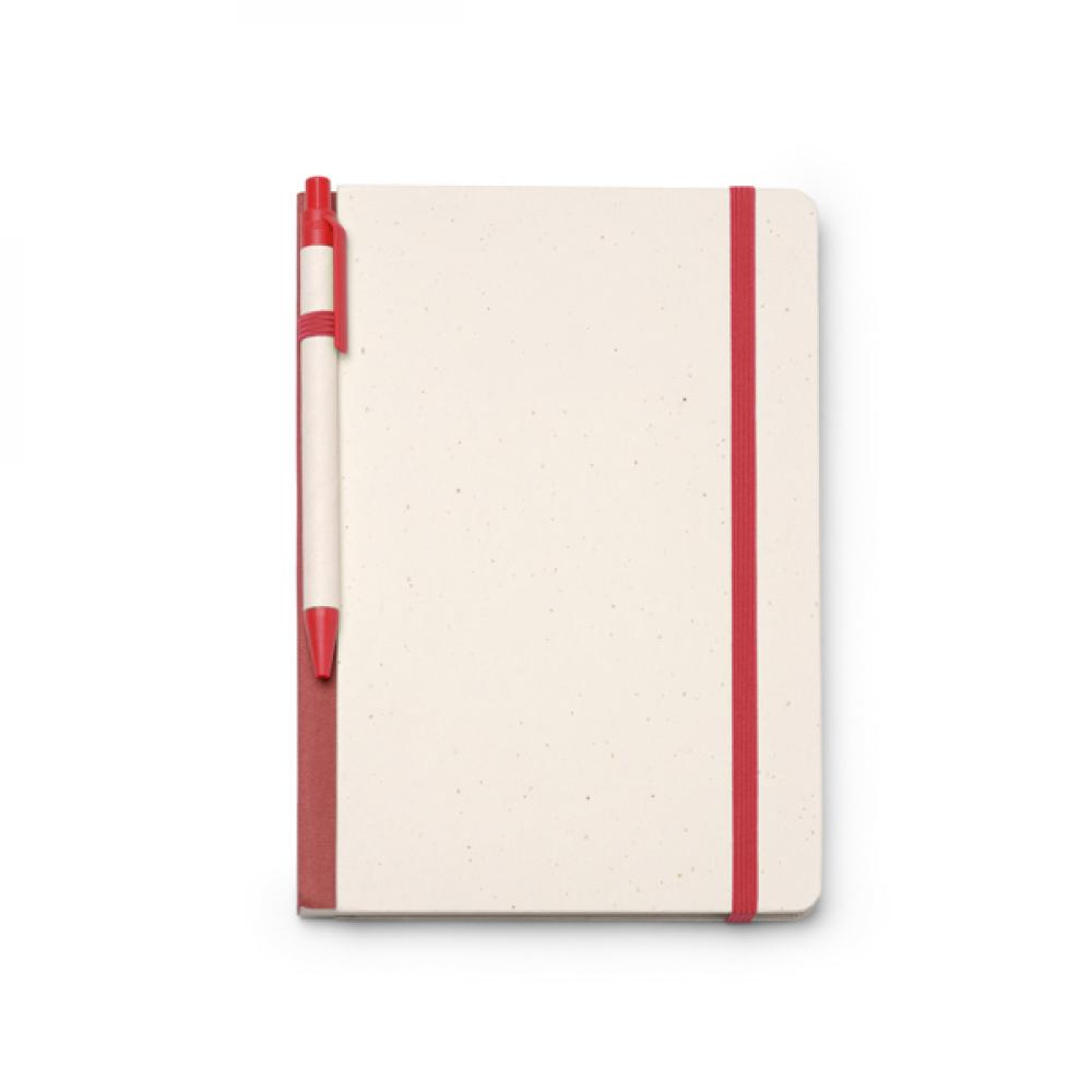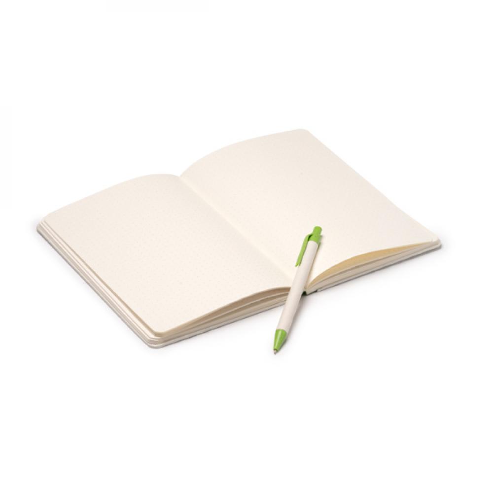 Блокнот формата A5 из переработанных молочных картонов. Жесткая обложка с эластичной лентой и закладкой в цвете шариковой ручки. Синий чернильный стержень. 80 гладких листов. Представлен в коробке в экологичном дизайне.