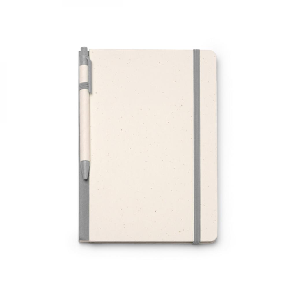 Блокнот формата A5 из переработанных молочных картонов. Жесткая обложка с эластичной лентой и закладкой в цвет ручки-шарика. Синий чернильный стержень. 80 гладких листов. Представлен в коробке в экологичном дизайне.