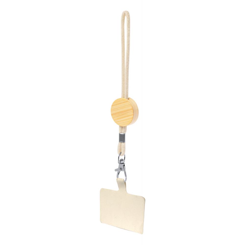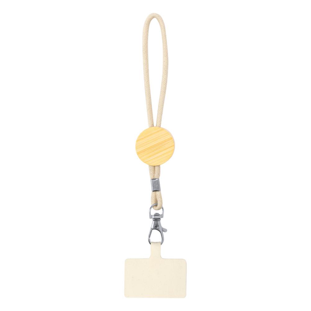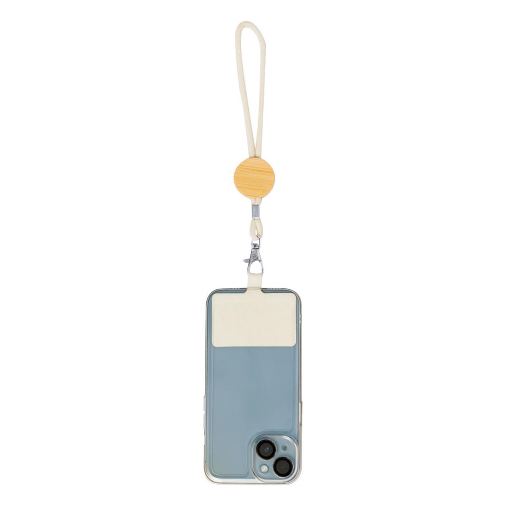 Мобильный держатель на запястье из хлопка с круглой бамбуковой ярлычкой, вставкой для телефона и металлическим карабином.