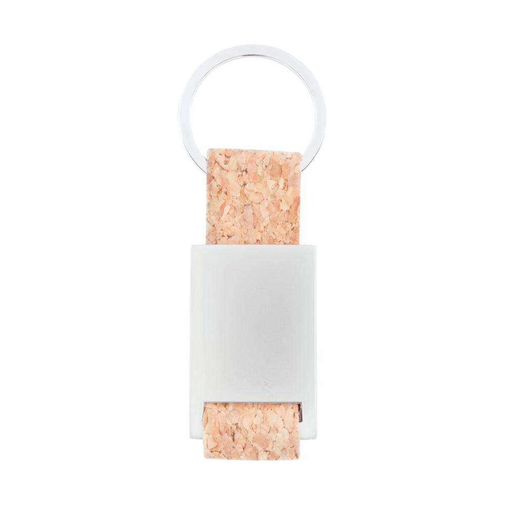 Прямоугольный металлический брелок для ключей с ремешком из натуральной пробки и металлическим кольцом.