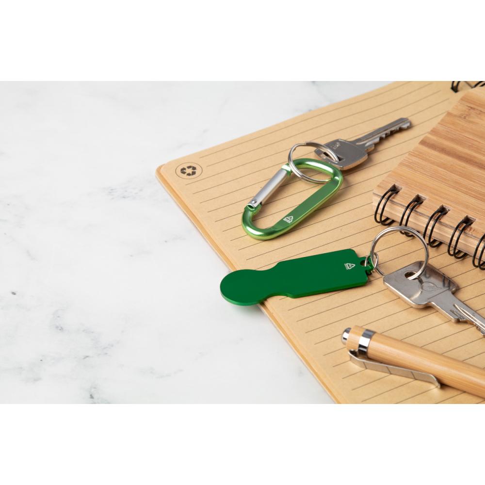 Переработанный алюминиевый карабин с металлическим кольцом для ключей.