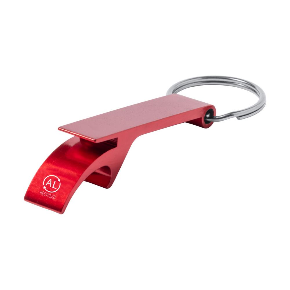Бутылка из переработанного алюминия и консервный нож с металлическим брелоком для ключей.