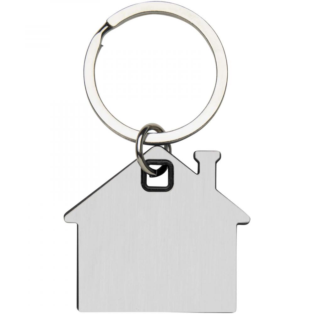 Брелок в форме домика с пластиной из нержавеющей стали с матовым дизайном с обеих сторон и цветной пластиковой вставкой в центре.