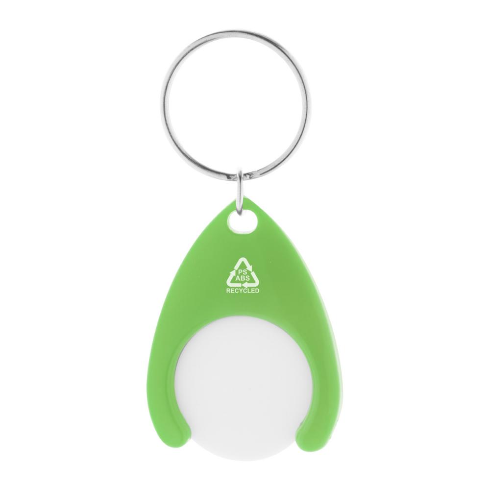 Брелок из переработанного пластика ABS и переработанного пластика PS с металлическим кольцом и монеткой для тележки. Размер монетки: ø24×2 мм.