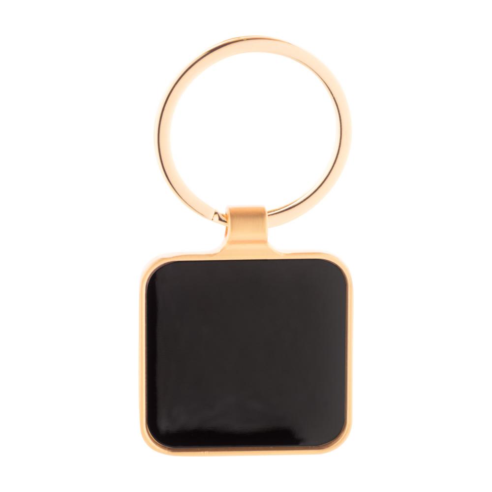 Квадратный металлический брелок в золотом цвете с гунметаллической пластиной. В коробке из крафт-бумаги.