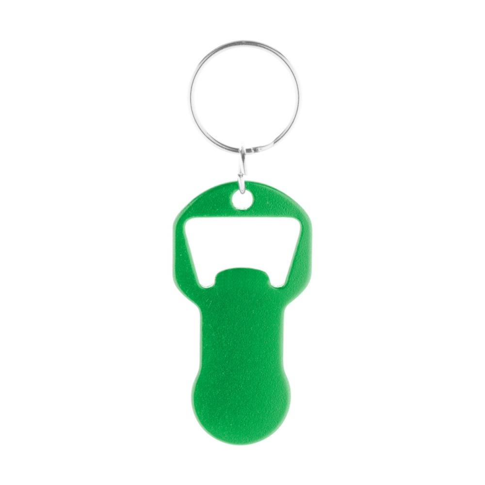 Брелок для ключей с открывалкой для бутылок из переработанного алюминия и монеткой для тележки.