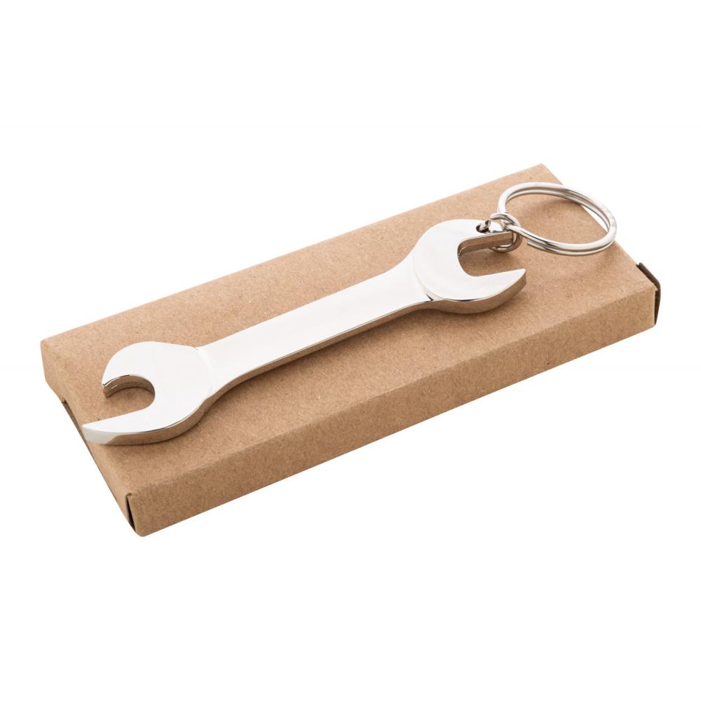 Открывалка для бутылок в форме гаечного ключа из металла на кольце. В коробке из крафт-бумаги.