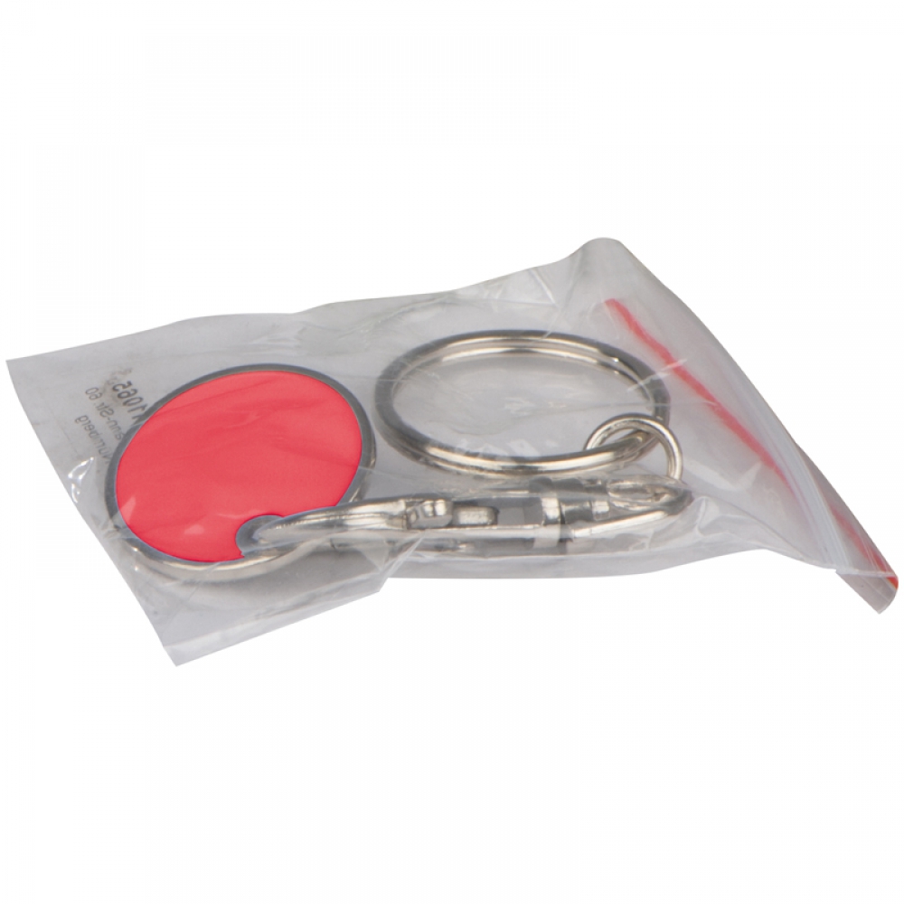 Металлический брелок с карабином и жетоном для магазинной тележки. Логотип могут быть размещен на одной стороне жетона.