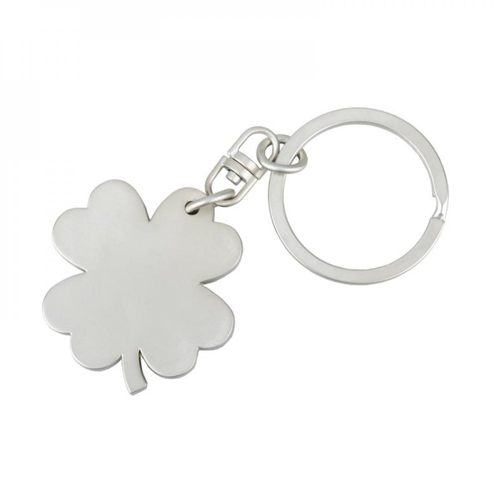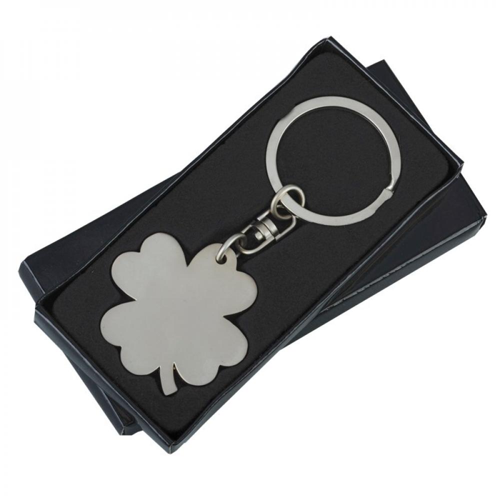 Металлический брелок с четырьмя листочками в виде клевера, приносящий удачу. Упакован в черную подарочную коробку.