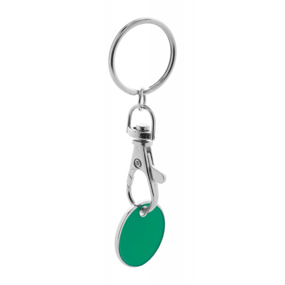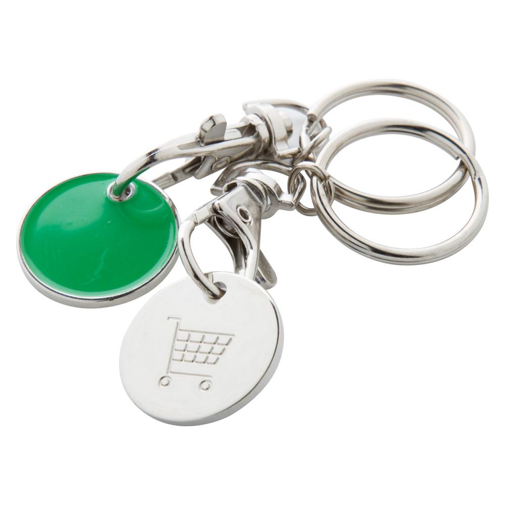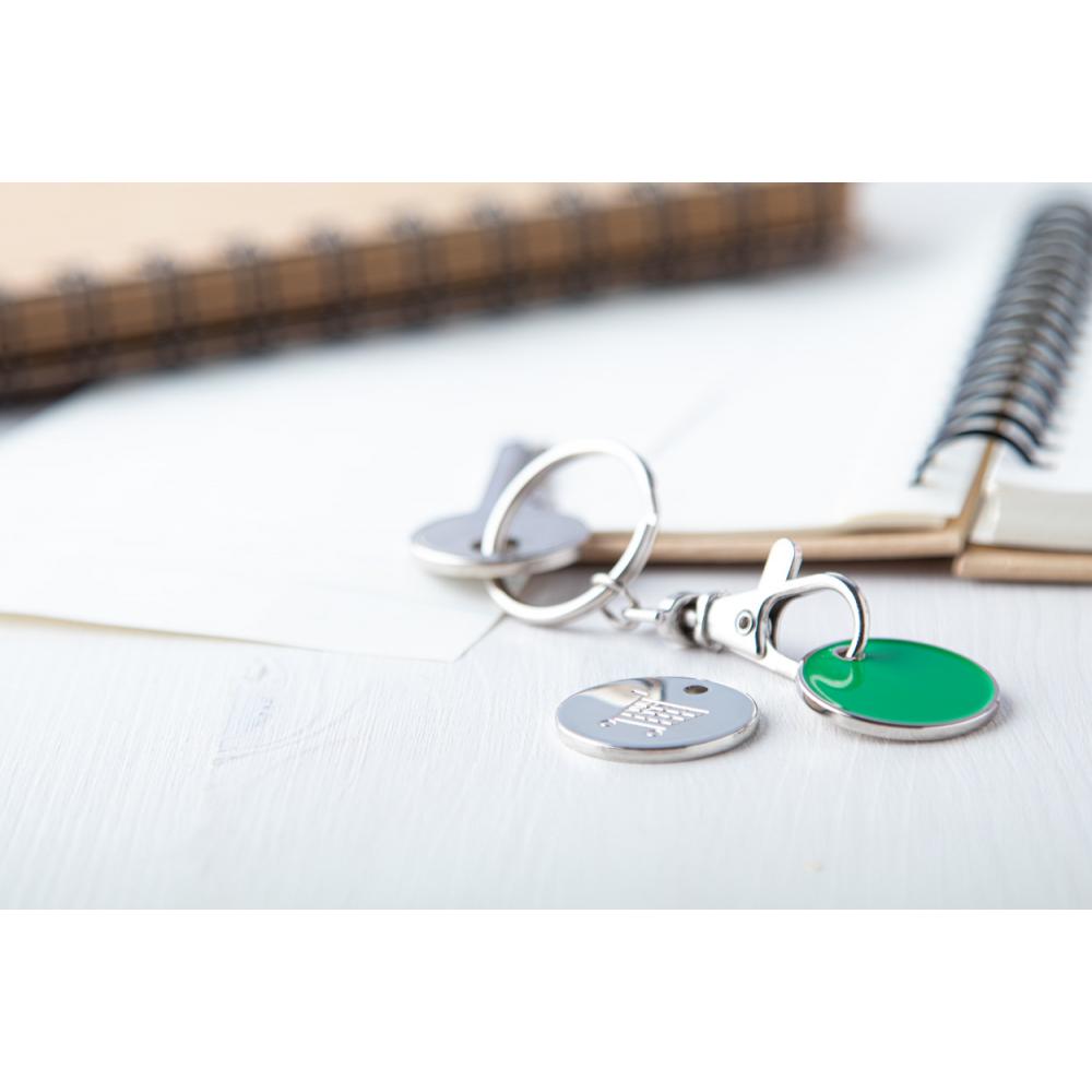 Металлический брелок для монет с тележкой для покупок. Одна сторона монеты расписана, на другой выгравирована тележка для покупок. Размер монеты: ø23 × 1,7 мм.