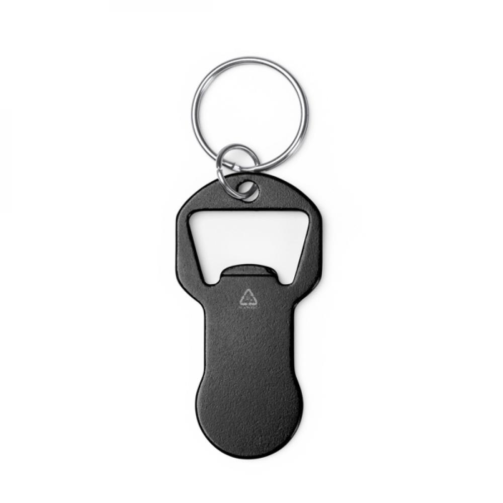 Брелок для ключей из переработанного алюминия с открывалкой для бутылок и монеткой для тележки. Широкая область для нанесения логотипа.