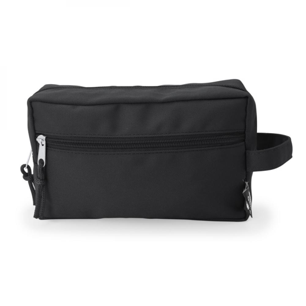 Туалетная сумка с двумя отделениями на молнии и соответствующим ремешком для переноски. Ремешок на подвеске и наружная этикетка с логотипом RPET.