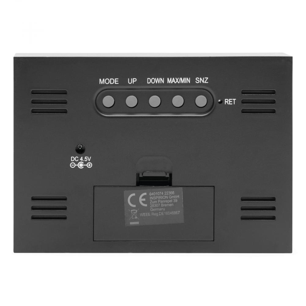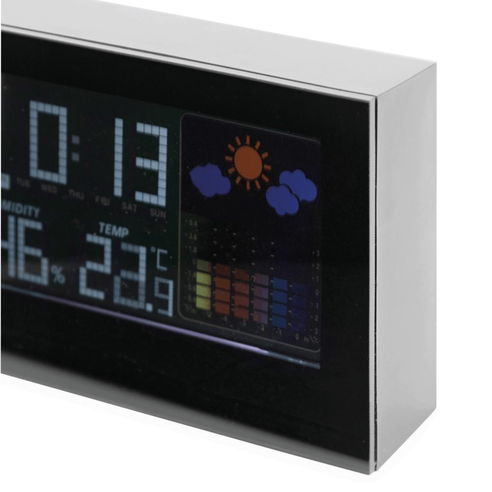 Метеостанция с функцией будильника, отображением даты и времени, гигрометром и термометром (для °C и °F), подсвечиваемый ЖК-экран - черный дисплей с цветными элементами и разъемом для подключения адаптера (адаптер не включен)