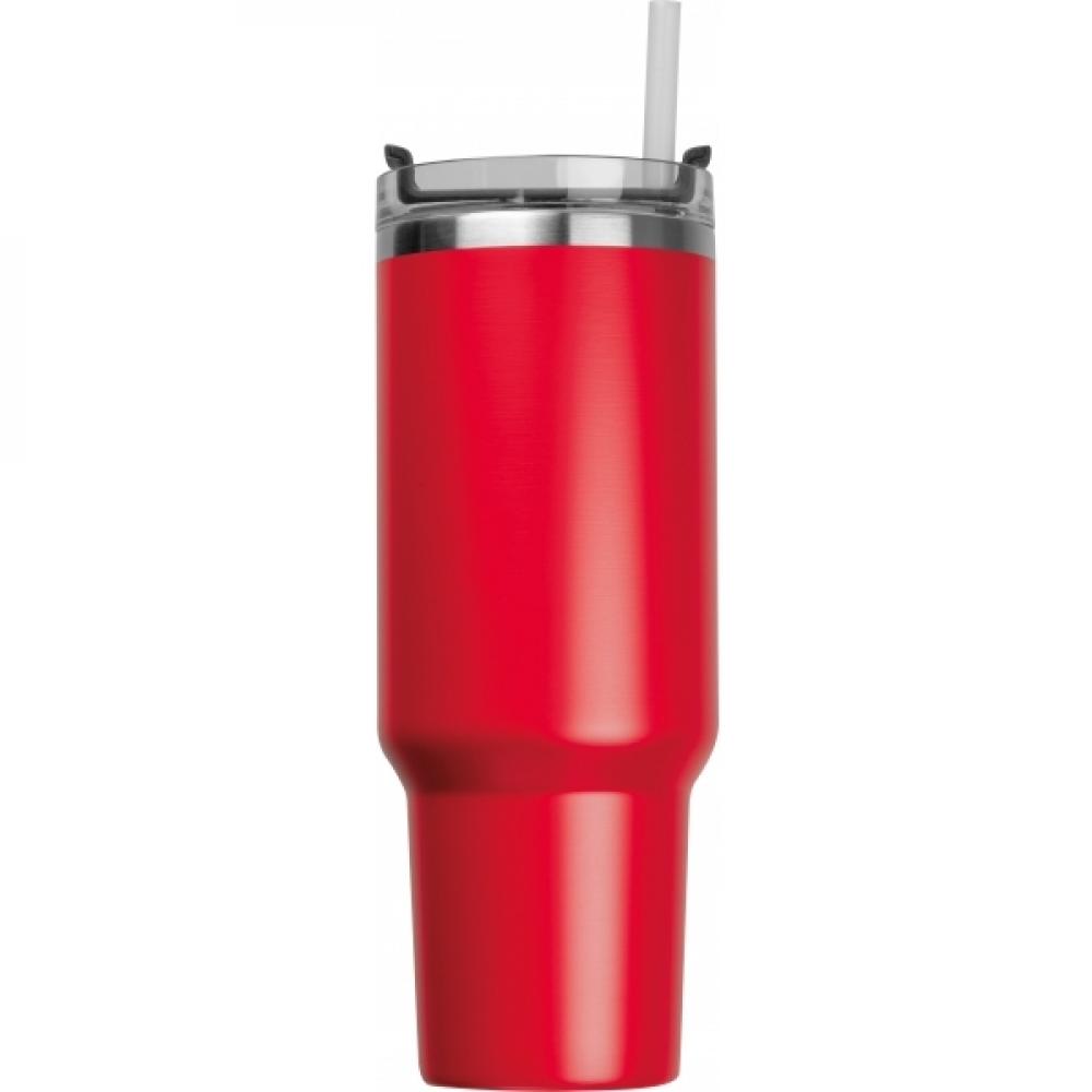 Двухстенный XXL стакан для напитков (вместимость около 1,2 литра) из нержавеющей стали с вакуумной изоляцией, включая соломинку, крышку и ручку из пластика без содержания бисфенола А. Его узкий дизайн дна подходит для всех стандартных держателей для стаканов.