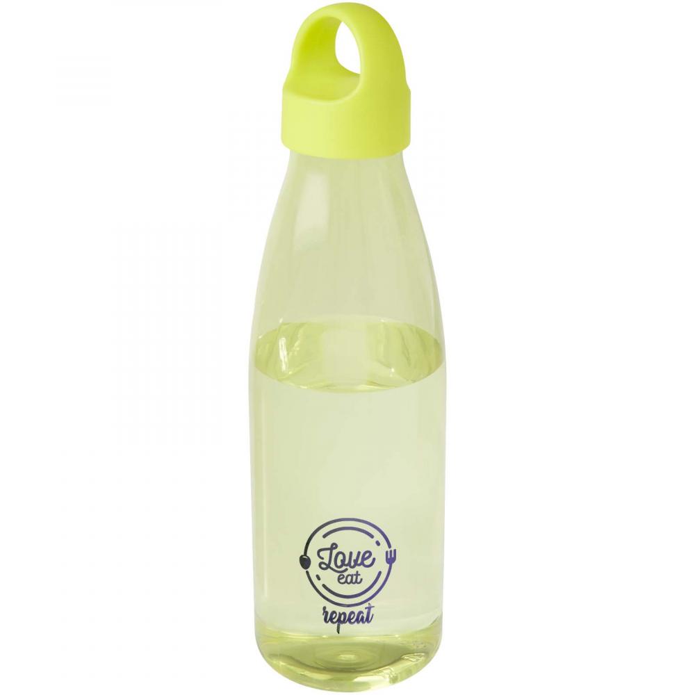 Бутылка для воды, изготовленная из сертифицированного RCS переработанного PET, с удобной ручкой для переноски, интегрированной в крышку. Сертифицировано EFSA (Европейское агентство по безопасности продуктов питания). Объем: 800 мл. Не содержит BPA.
