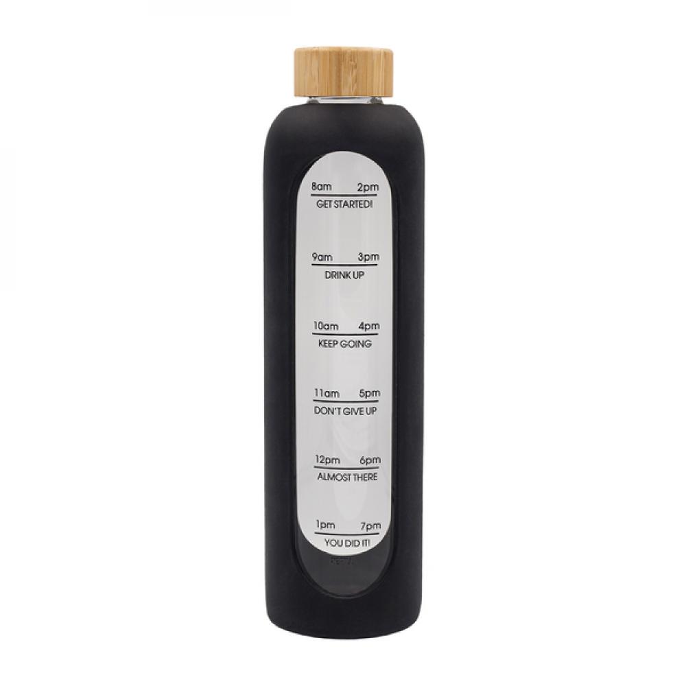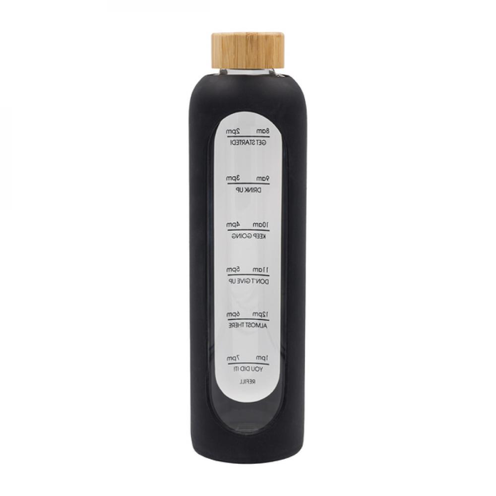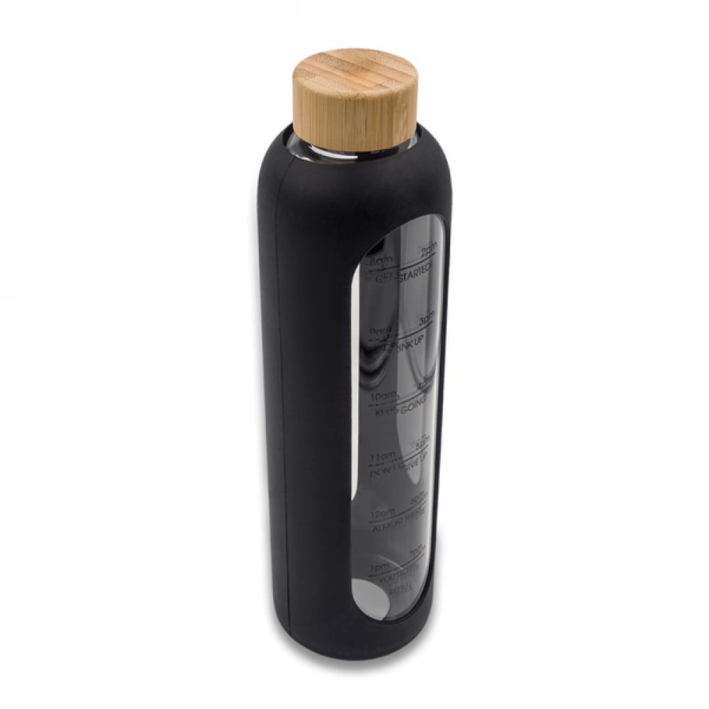 Бутылка из боросиликатного стекла на 1100 мл с герметичной крышкой, чёрным силиконовым чехлом и бамбуковой крышкой.