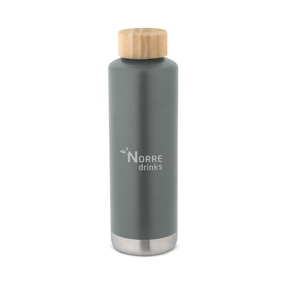 Бутылка из нержавеющей стали с двойными стенками и вакуумной изоляцией, внутренняя стенка с медным покрытием и бамбуковая крышка с силиконовым уплотнением для дополнительной защиты. Бутылка имеет емкость до 640 мл и сохраняет напитки горячими в течение 16 часов и холодными в течение 57 часов.