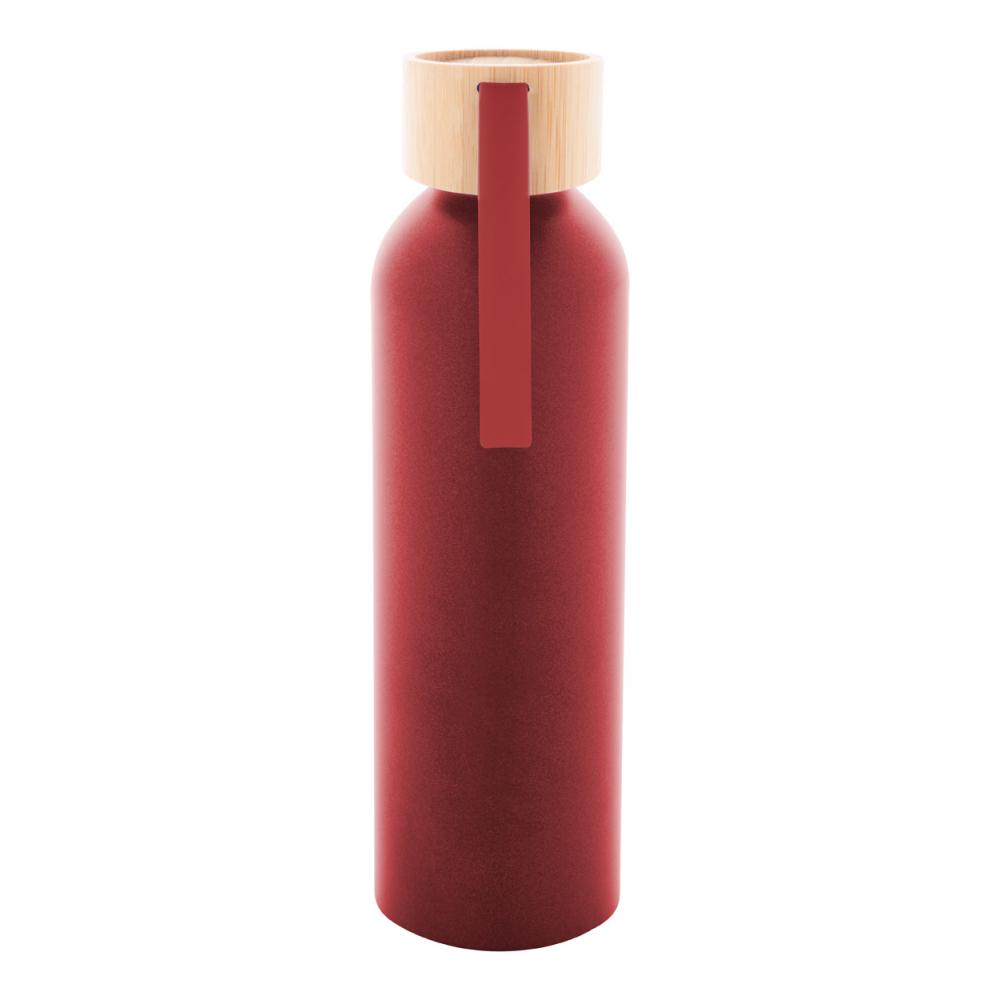 Бутылка из переработленного алюминия с крышкой из бамбука и силиконовым ремешком подходящего цвета, 600 мл.