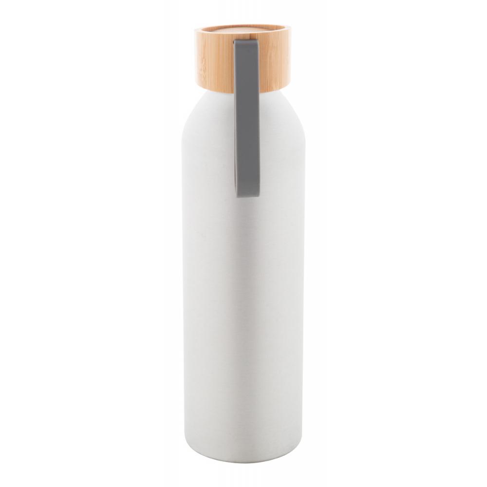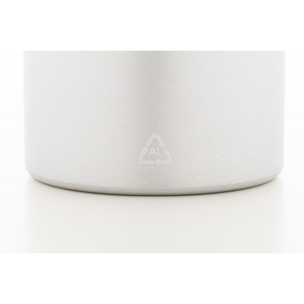Бутылка из переработленного алюминия с крышкой из бамбука и силиконовым ремешком подходящего цвета, 600 мл.