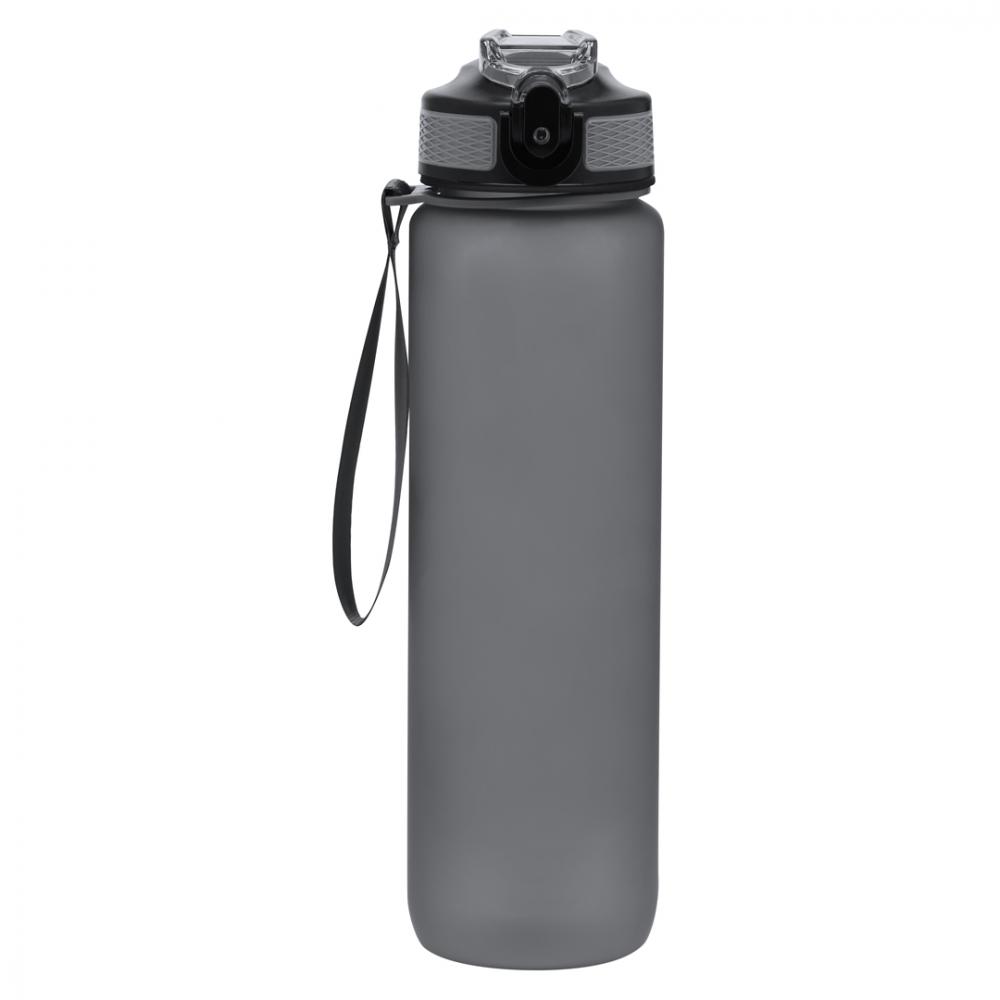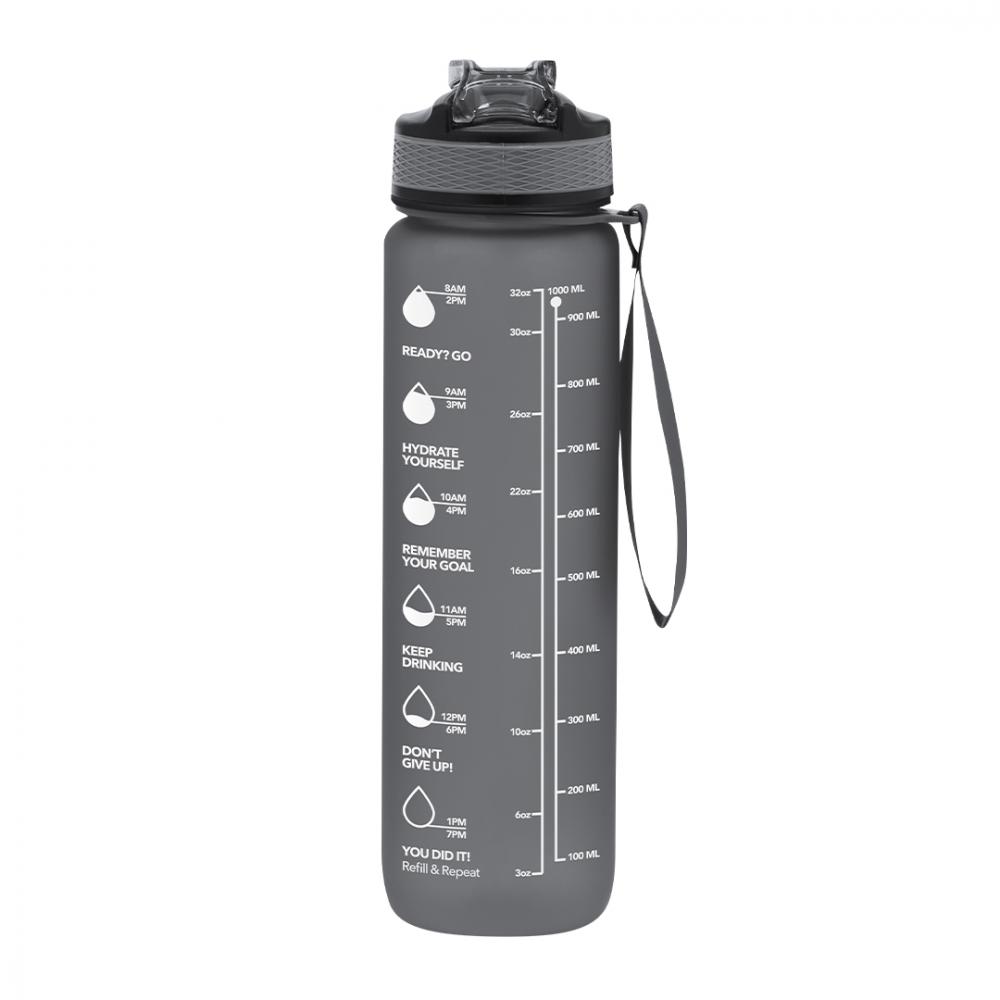 Бутылка объемом 1 л из прочного PETG с полупрозрачным матовым покрытием, с индикатором объема в литрах и унциях, а также мотивирующими фразами, призывающими поддерживать достаточный уровень увлажнения. С черной завинчивающейся крышкой. В комплект входит безопасный запорный дозатор и удобный ремешок для переноски. Не содержит бисфенола. 1 л. PETG