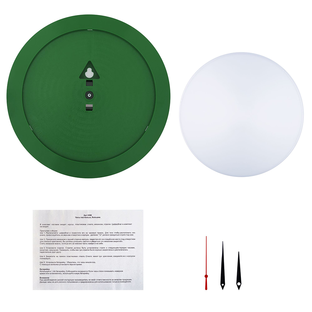Часы поставляются в разобранном виде: корпус, крышка, стрелки, механизм и индивидуальная упаковка — коробка. Часовая и минутная стрелки — черного цвета, секундная — красного цвета.