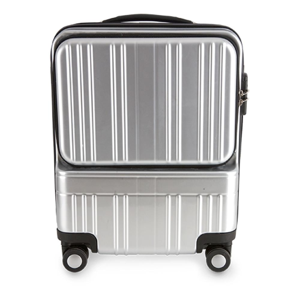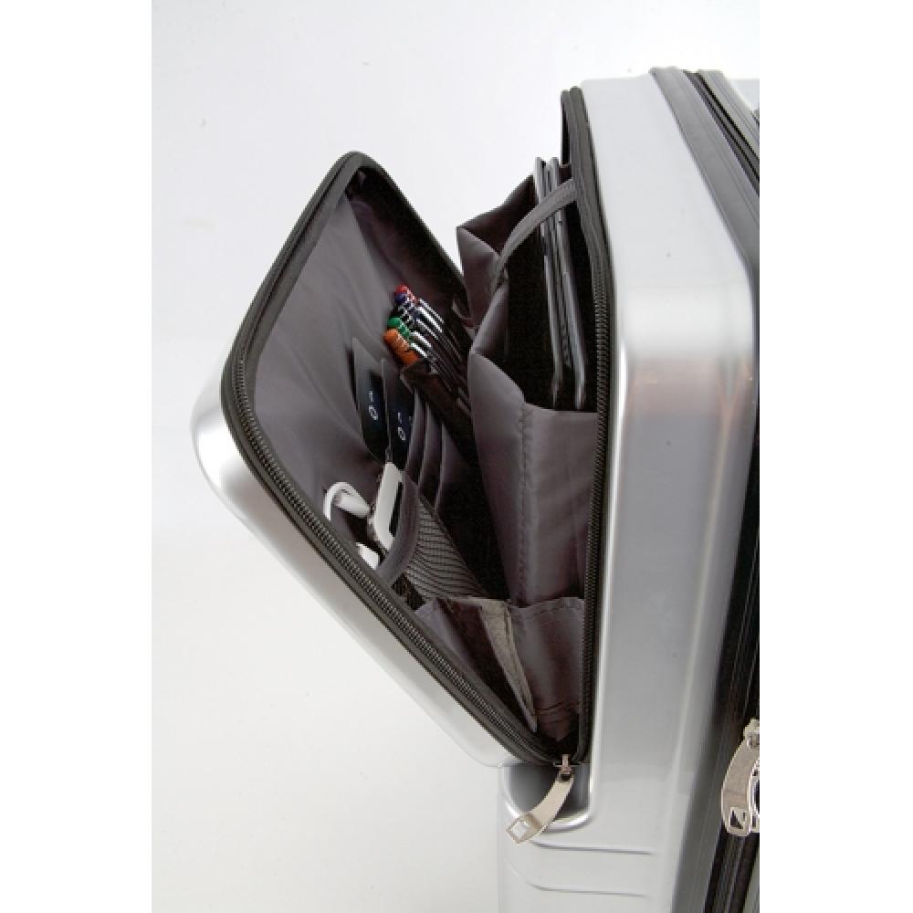 Тележка с внешним покрытием из поликарбоната с металлическим эффектом. Две основные молнии оснащены замком безопасности. Центральное открытие делит тележку на две части, обеспечивая удобный доступ и большую вместимость: с одной стороны — два отделения на молнии и различные карманы, с другой — крепления с эластичными ремнями. Основное отделение имеет карман для ноутбука и различные отделения для ручек, карт и других мелочей. Кроме того, тележка складывается и фиксируется с помощью липучек по бокам, что делает её безопасной.