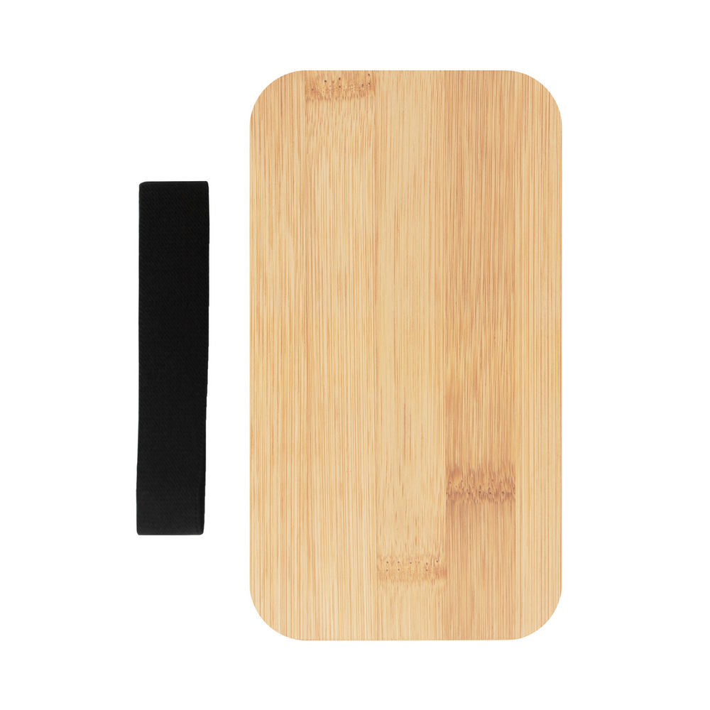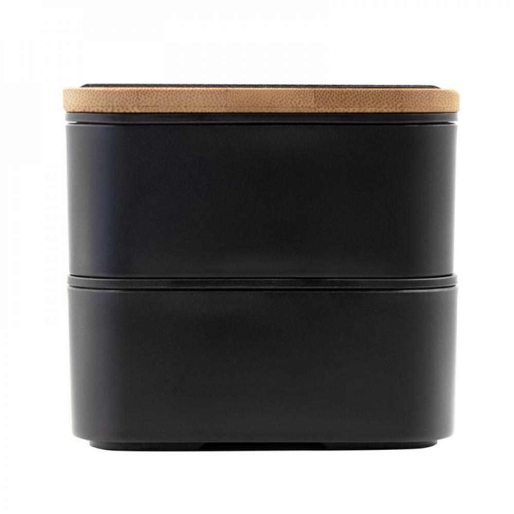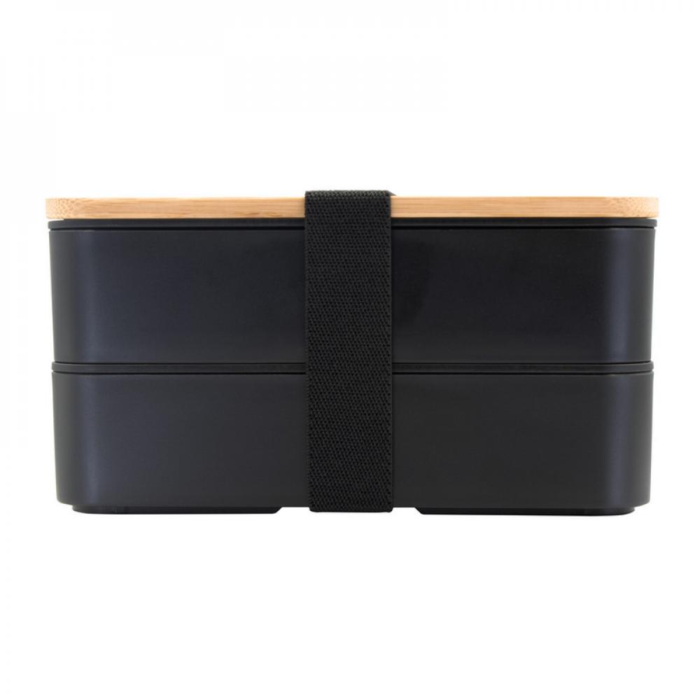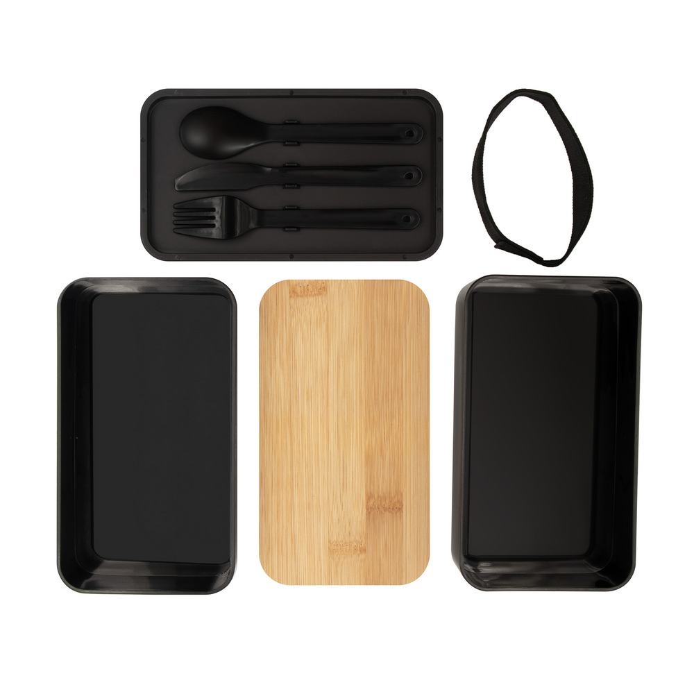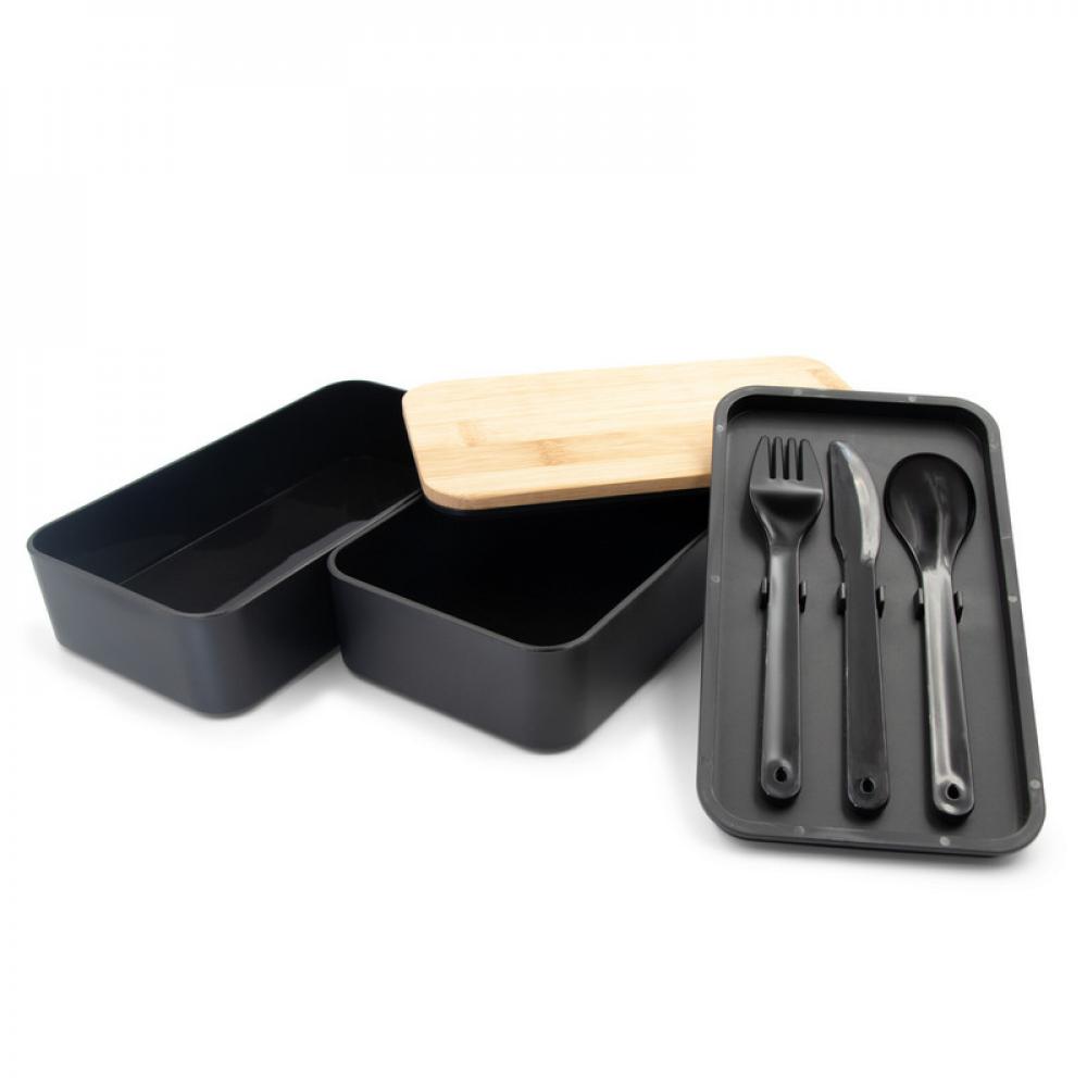 Ланч-бокс 2 в 1, 2 контейнера по 500 мл, в комплекте: вилка, нож и ложка, один из контейнеров с крышкой с верхом из бамбука, второй контейнер с крышкой с местом для столовых приборов, контейнеры соединены эластичным ремешком, изделие из ПП, бамбука и резины.