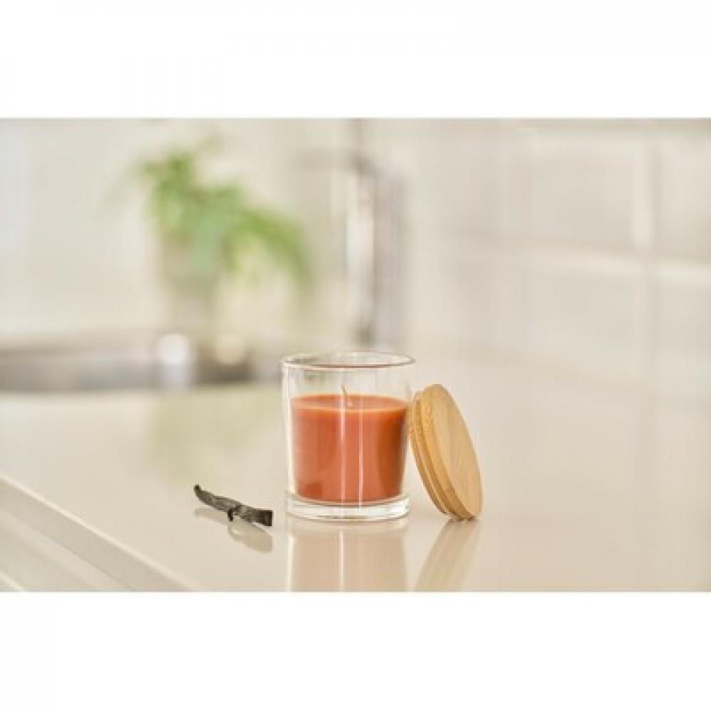 Ароматическая свеча с 120 граммами цветного воска и ванильным ароматом, помещенная в прозрачный стеклянный контейнер с бамбуковой крышкой, обеспечивает примерно 20 часов горения, упакована в индивидуальную белую картонную тубу.