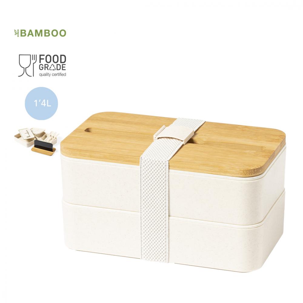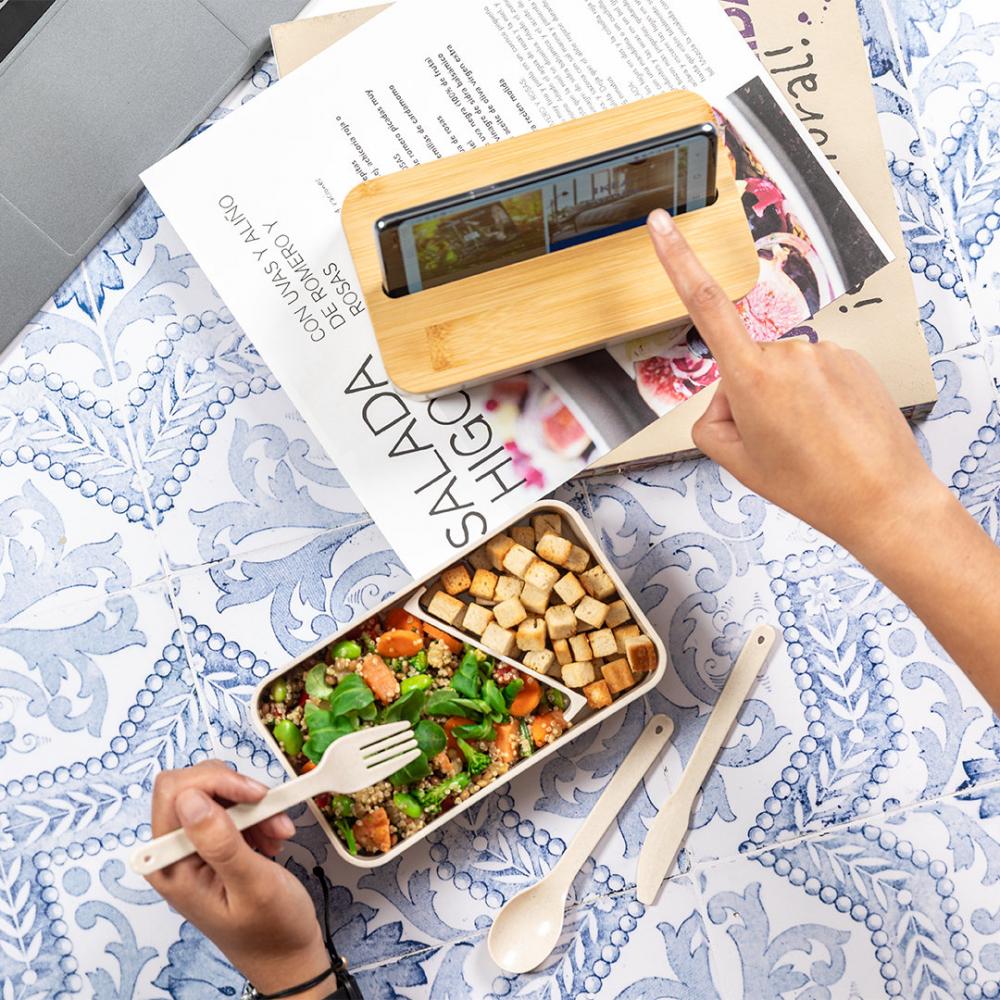 Набор ланч-боксов объемом 1,4 л, изготовленных из прочного полипропилена с прожилками, не содержащего бисфенол-А. Бамбуковая крышка со встроенным держателем для смартфона. Два контейнера по 700 мл каждый и внутреннее отделение с вилкой, ложкой и ножом.