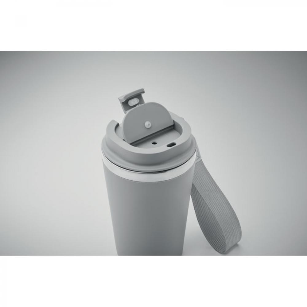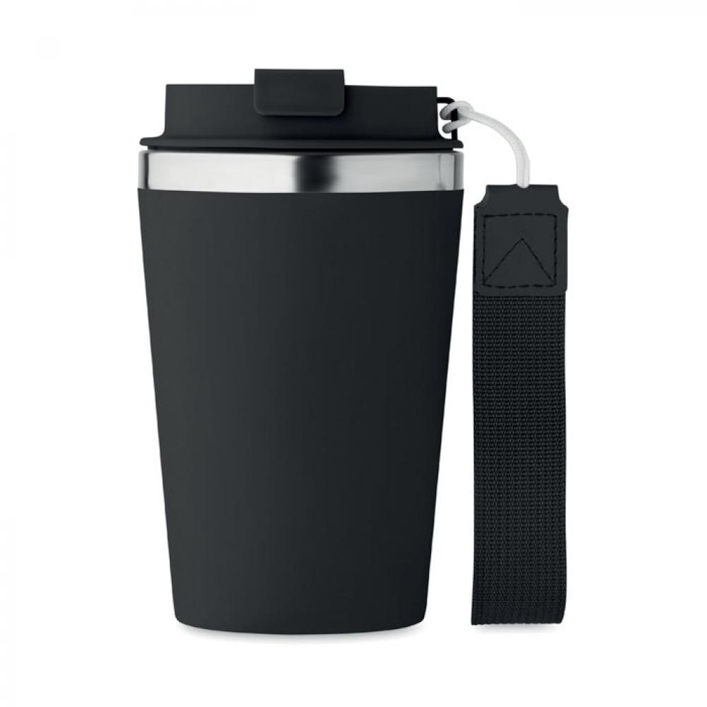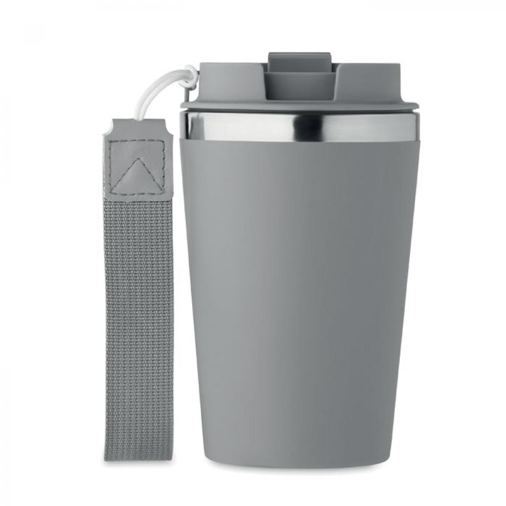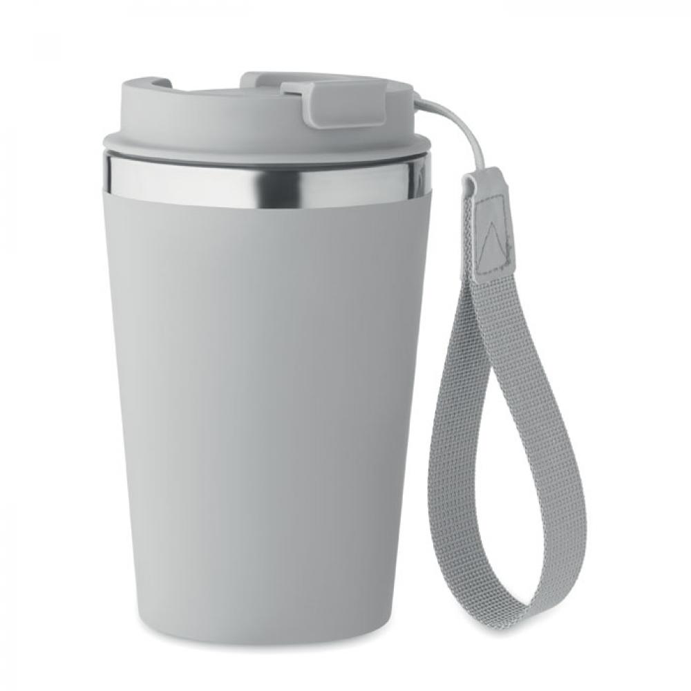 Термокружка с двойными стенками из переработанной нержавеющей стали (90%) и обычной нержавеющей стали (10%) с внешним покрытием из переработанного полипропилена с ремешком для запястья из RPET. Объем: 350 мл. Герметична.