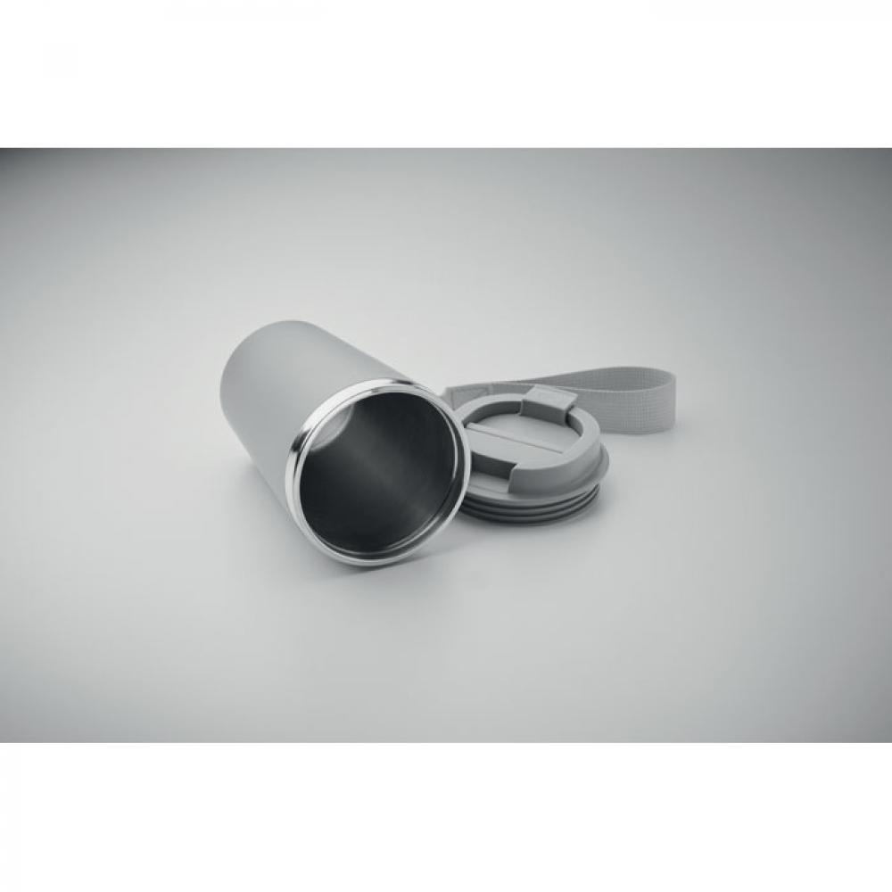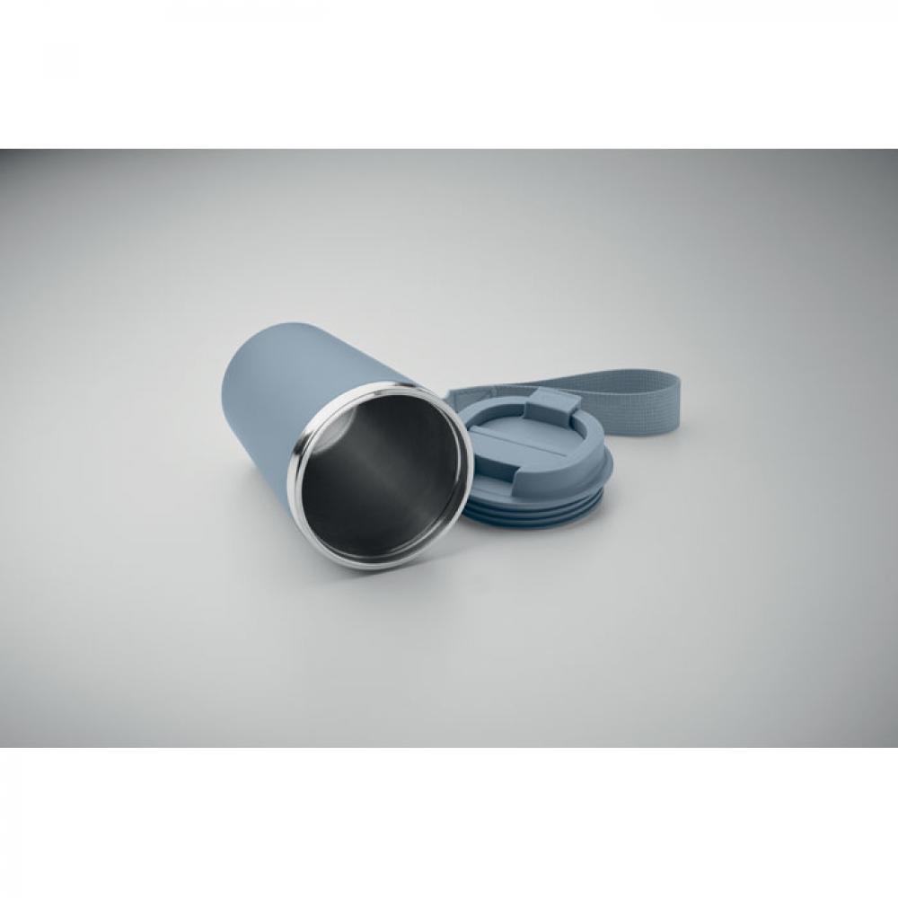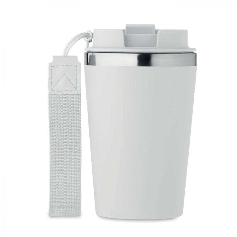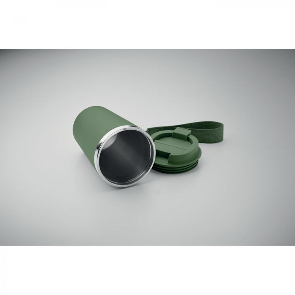 Термокружка с двойными стенками из переработанной нержавеющей стали (90%) и обычной нержавеющей стали (10%) с внешним покрытием из переработанного полипропилена с ремешком для запястья из RPET. Объем: 350 мл. Герметична.