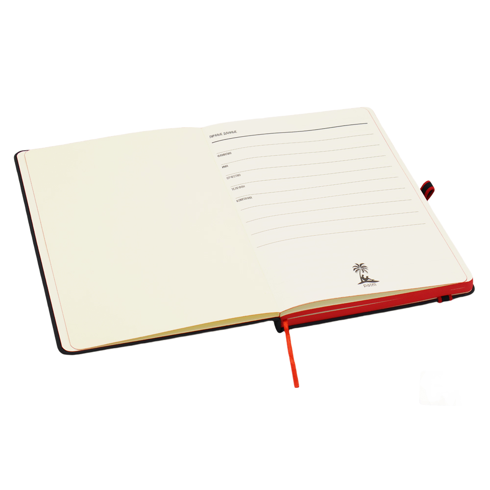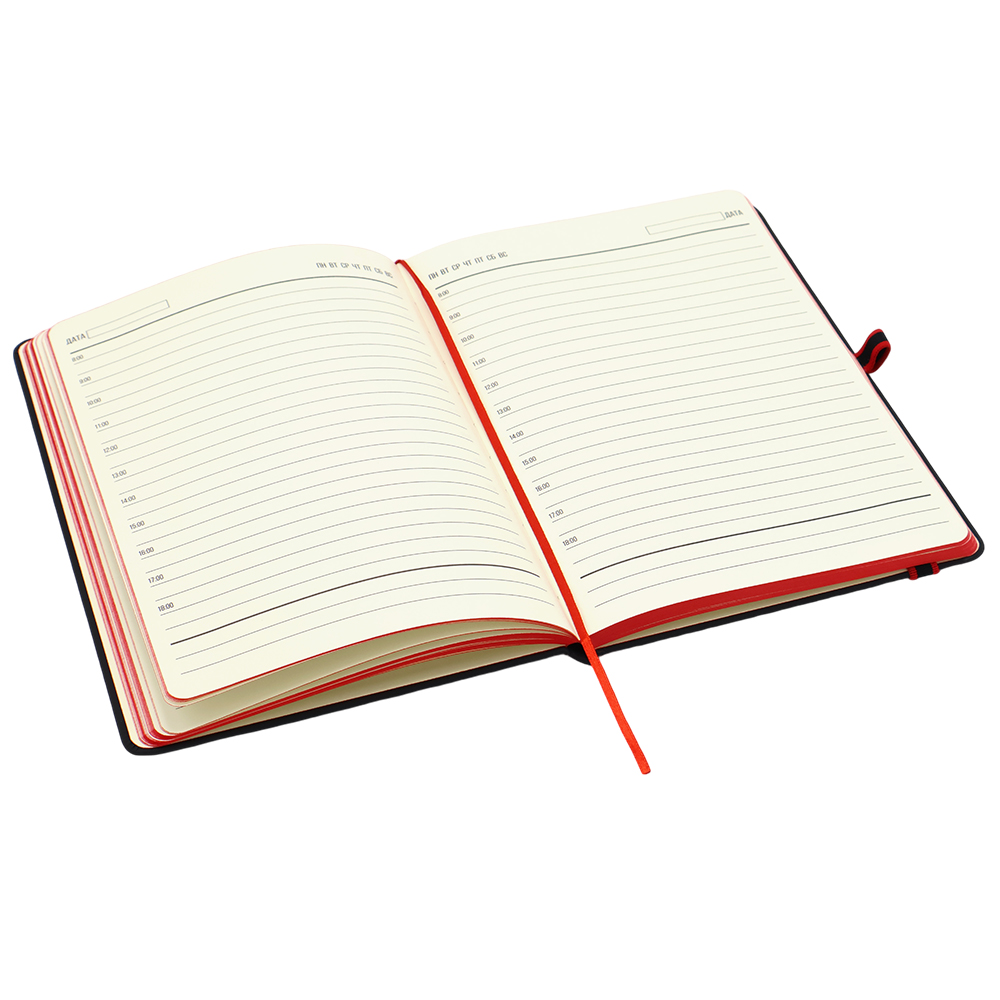 Ежедневник Sir Lewis — выполнен в твердой обложке. Имеет удобную, широкую резинку (1 см.) и держатель для ручки с ярким акцентом. Закладка и край — также в акцентном цвете. В начале ежедневника страничка с личными данными.