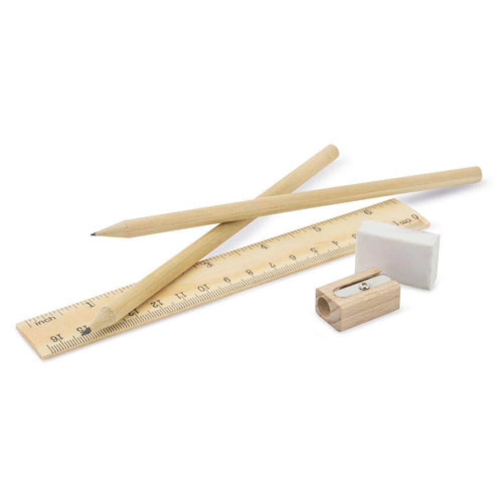 Более экологичный набор, состоящий из ластика, точилки для карандашей, линейки и двух карандашей, все из дерева.
