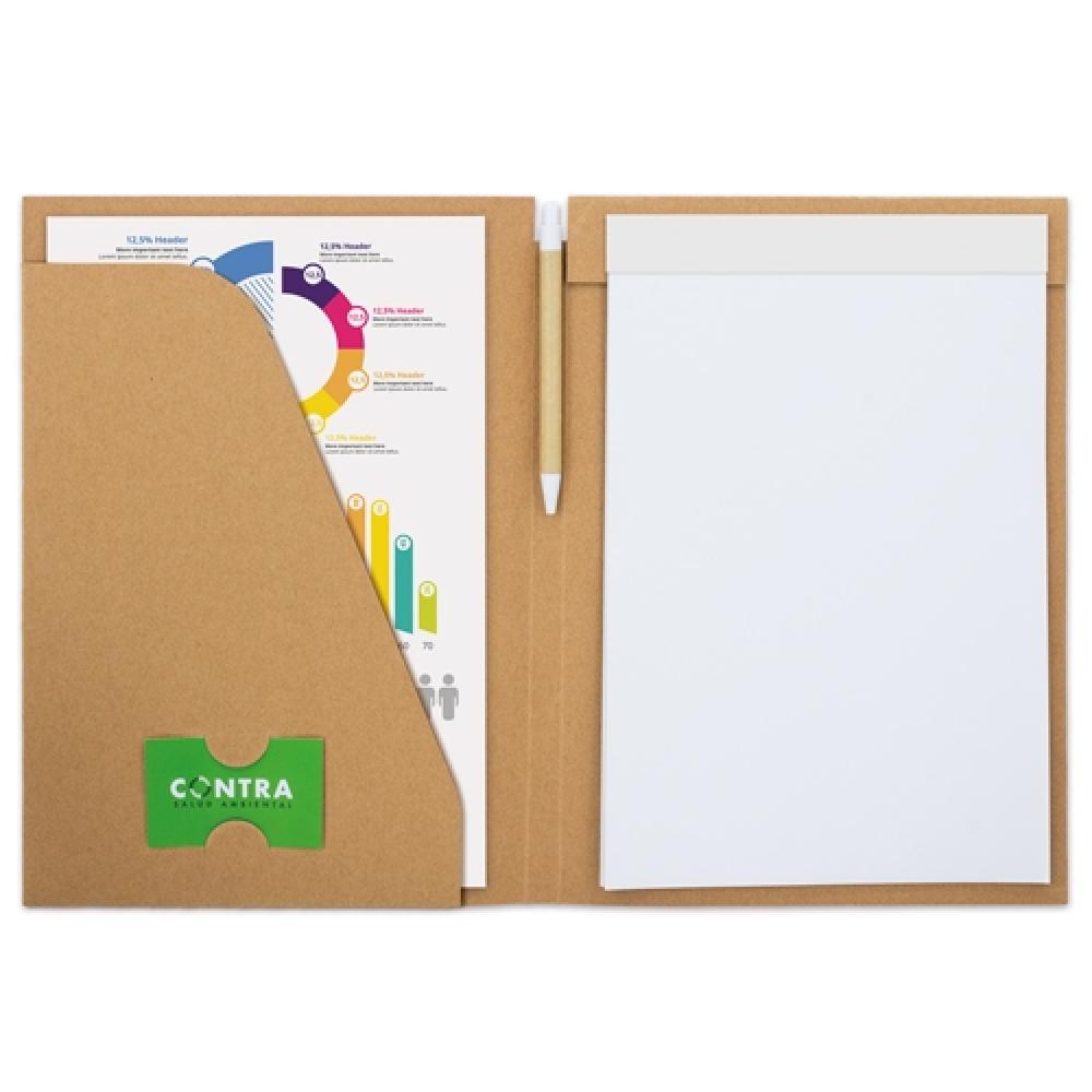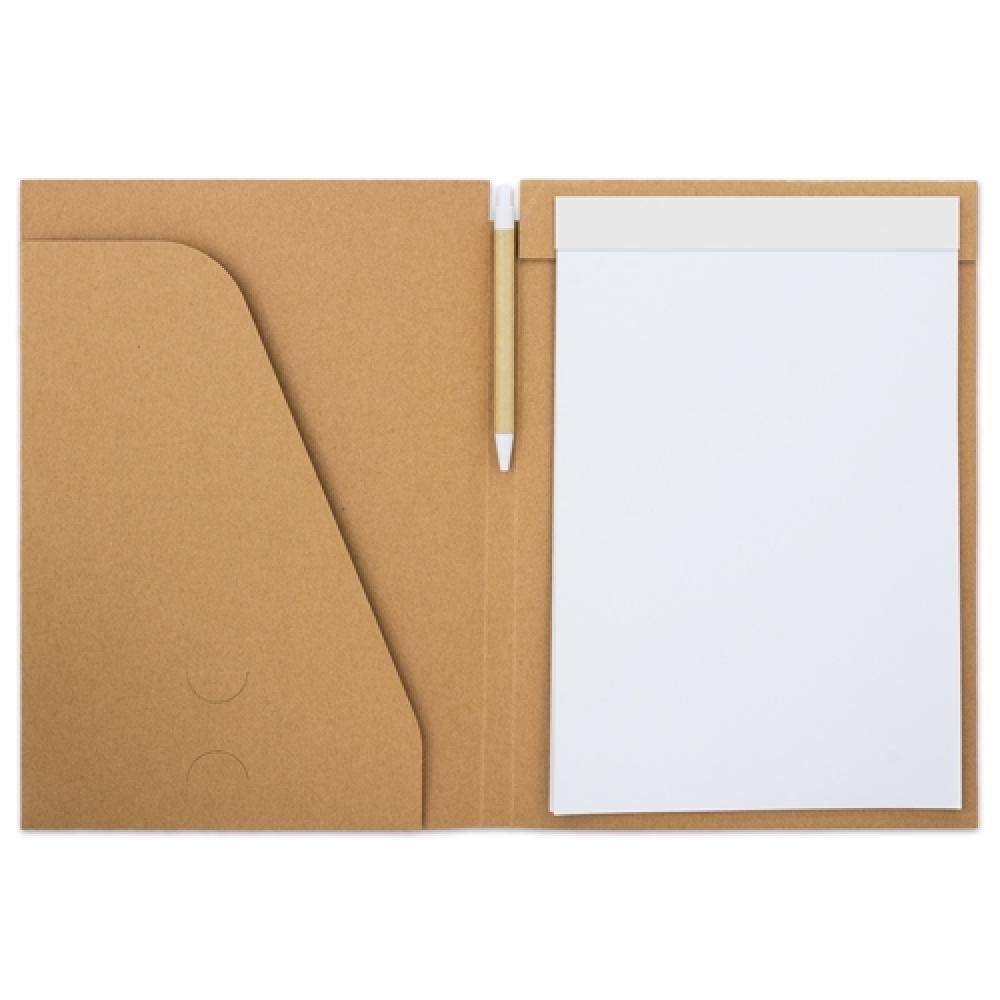 Легкая папка из жесткой переработанной картона, включает в себя синюю ручку и 18 обычных листов. Каждый предмет в индивидуальном упаковочном пакете.