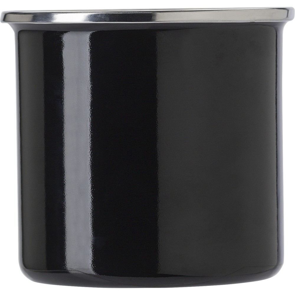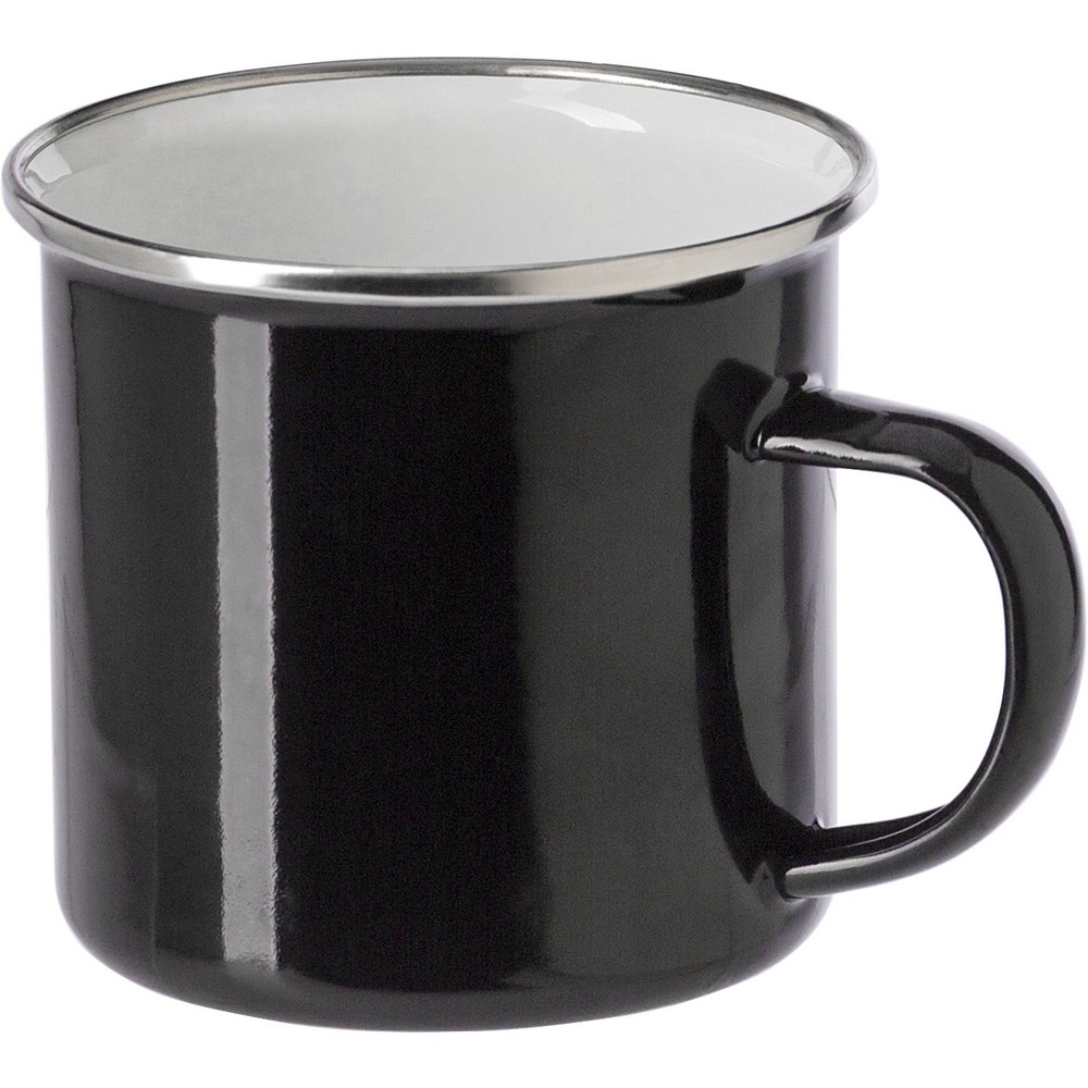 Эмалированная кружка 350 мл с краем из нержавеющей стали, упакована в картонную коробку.
