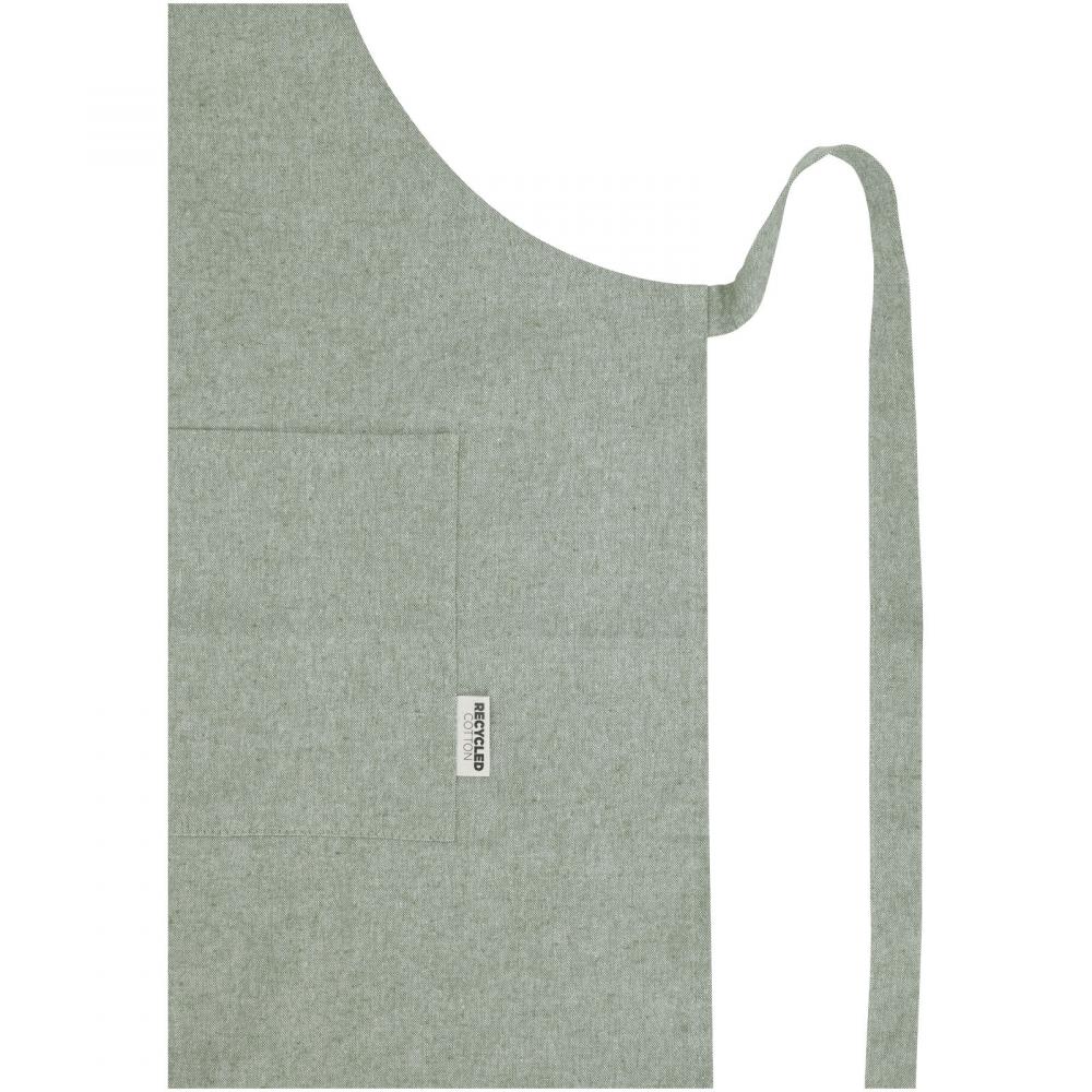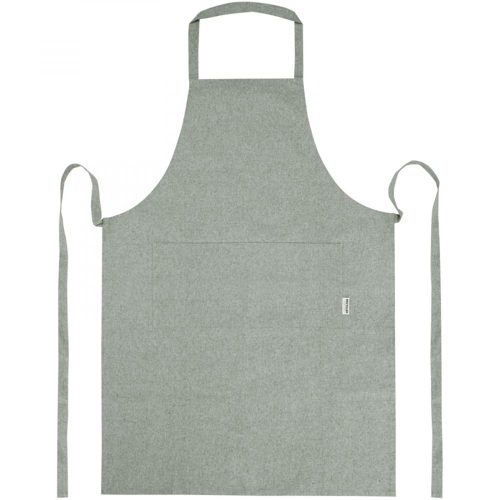 Фартук из переработанной хлопково-полиэстеровой смеси плотностью 200 г/м². Имеет два смежных кармана общим размером 45 x 20 см и завязку длиной 1 метр. Переработанный хлопок производится из отходов, образующихся на текстильных фабриках в процессе раскроя. Из-за особенностей переработанного хлопка возможны незначительные цветовые вариации, что придает изделию более аутентичный вид. Длина шейного ремешка: 55 см.