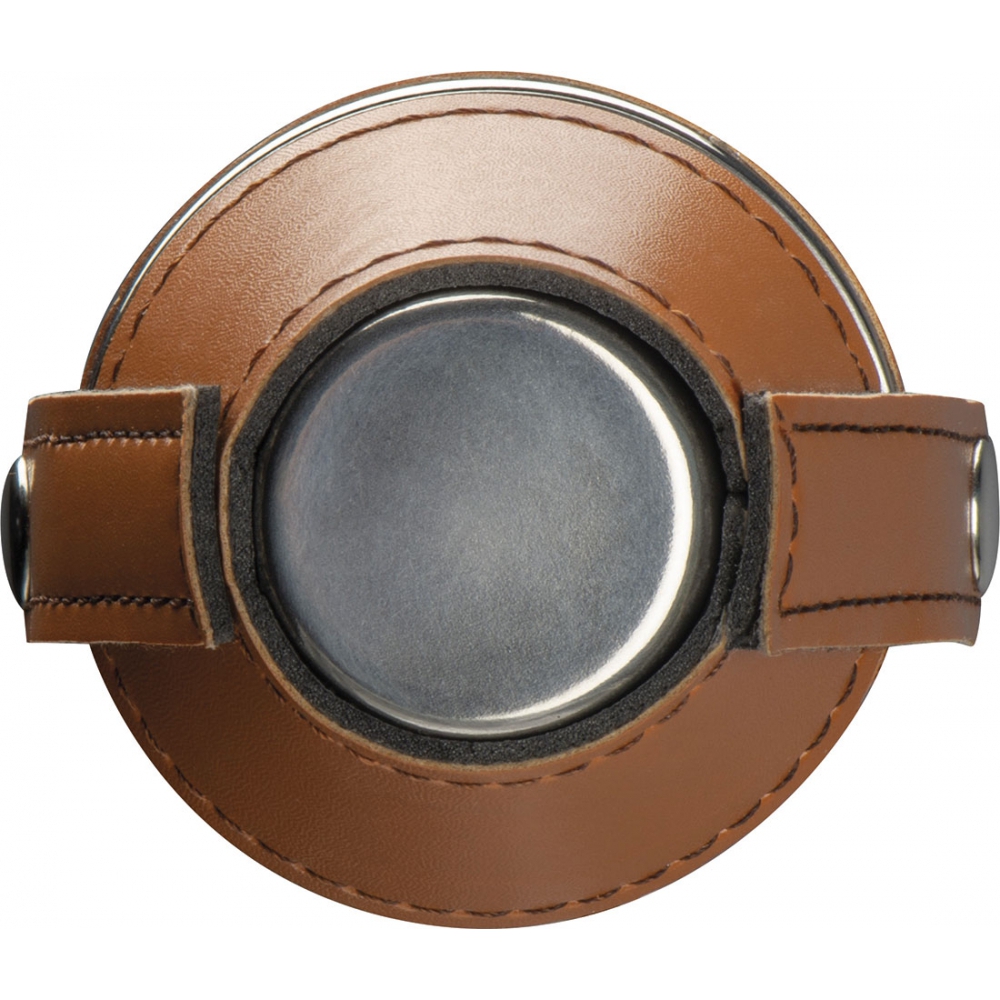 Круглая фляжка из нержавеющей стали, в полиуретановом футляре, имитирующим кожу, с двумя рюмками. Фляга имеет объем 230 мл, рюмки по 40 мл.