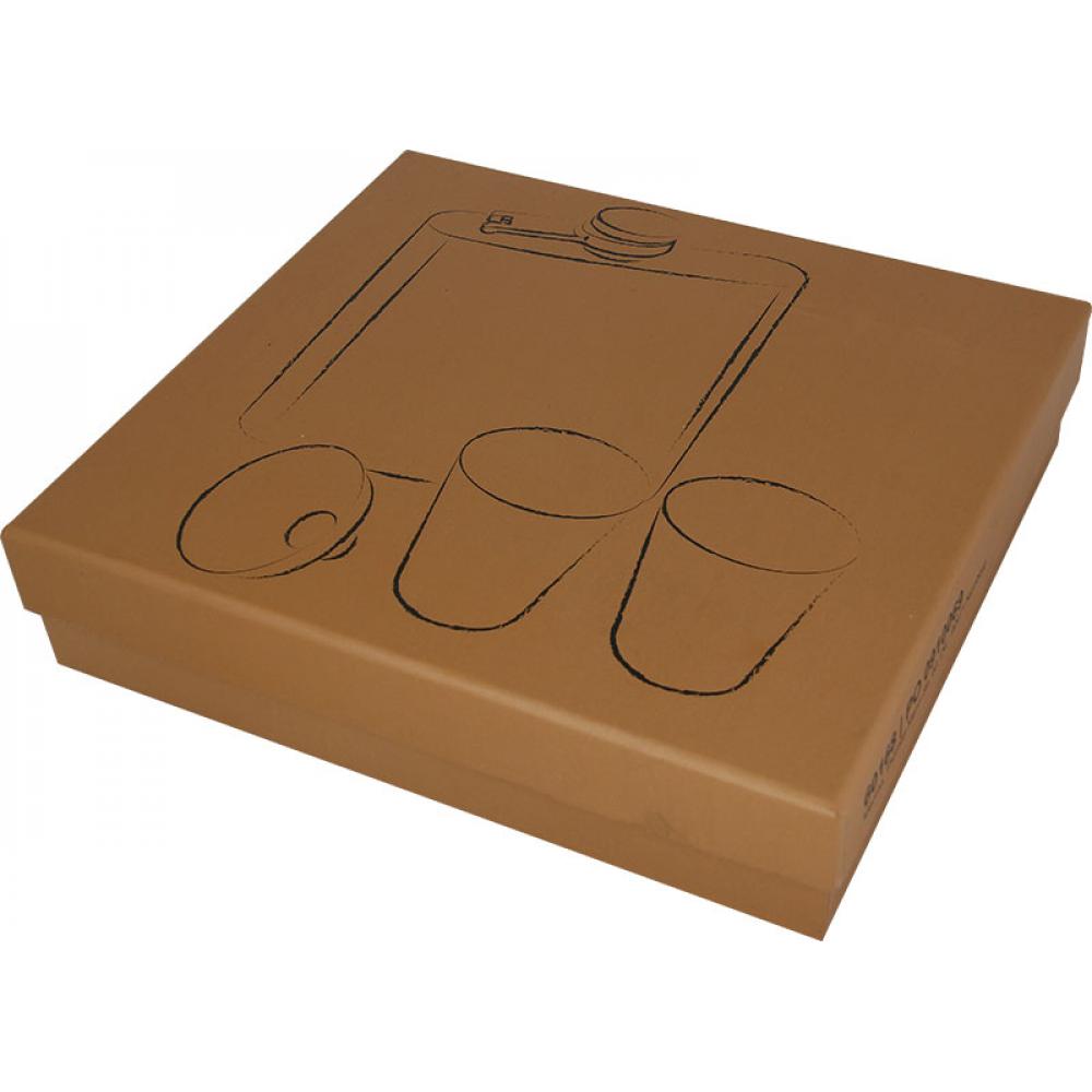 Классическая фляга изготовлена из нержавеющей стали в наборе с двумя рюмками. Все упаковано в картонную коробку.