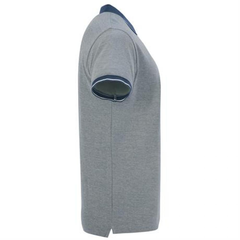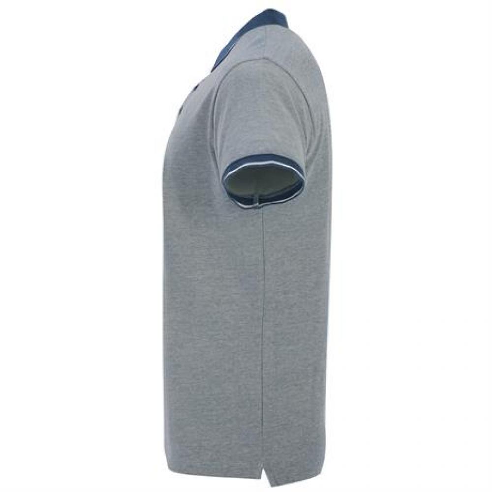 Футболка поло меланжевого цвета с короткими рукавами. Воротник и манжеты рукавов однотонного цвета в рубчик 1 x 1 с контрастной декоративной полосой. Внутренняя планка с декоративной контрастной лентой на три пуговицы. Вырез внизу по бокам с усиленными шв