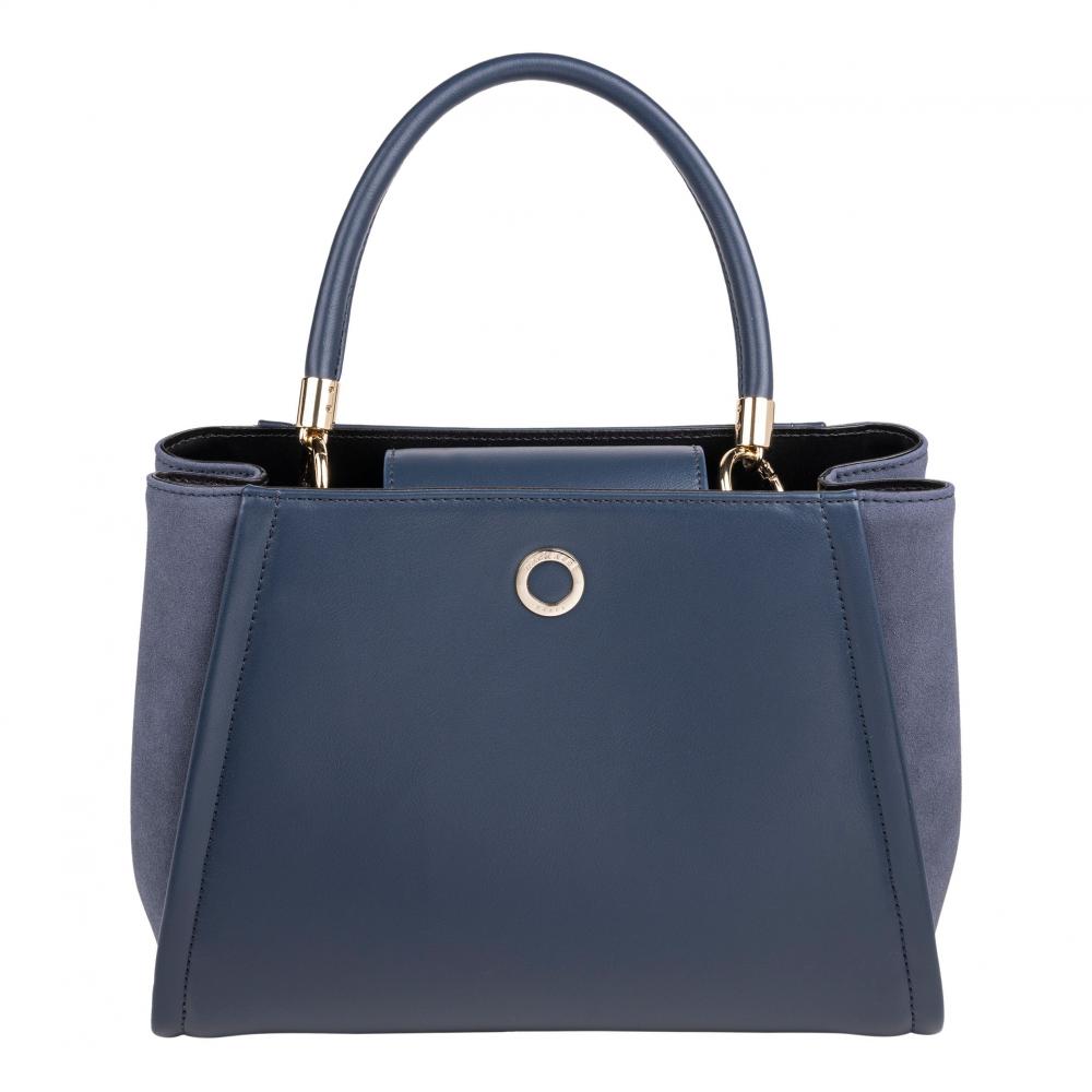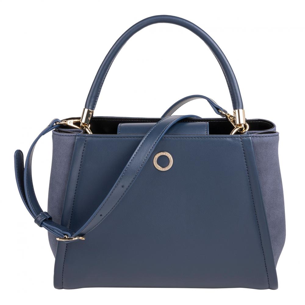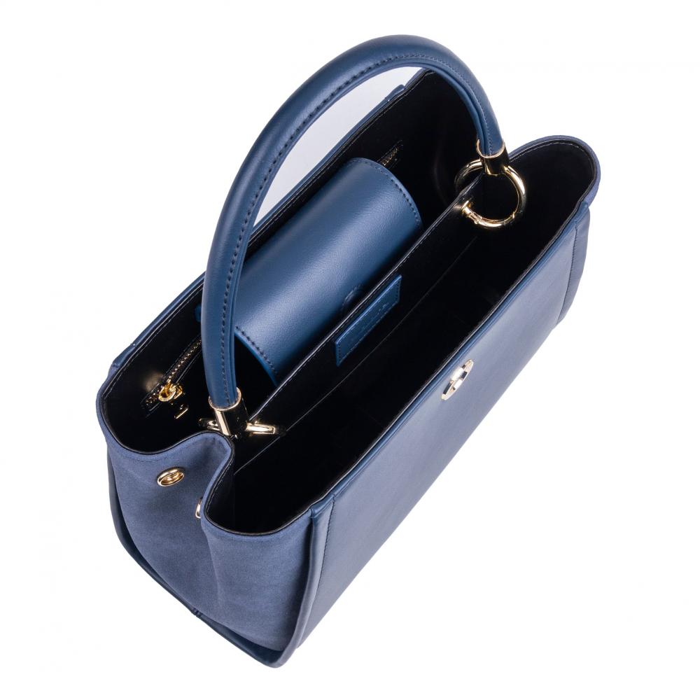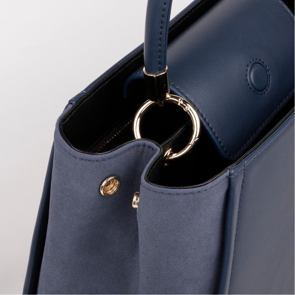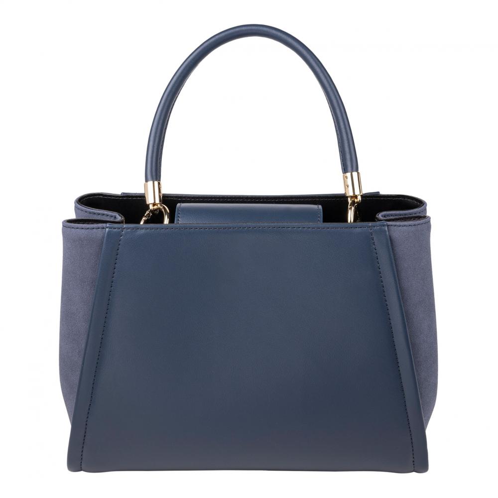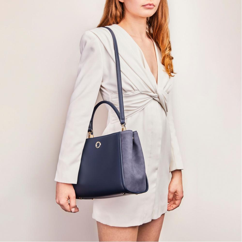 Синяя сумка из коллекции Alix оснащена двумя ручками по бокам и длинным регулируемым ремешком, который можно использовать для ношения на плече или через плечо. Контраст материалов придаёт ей классический и элегантный вид.