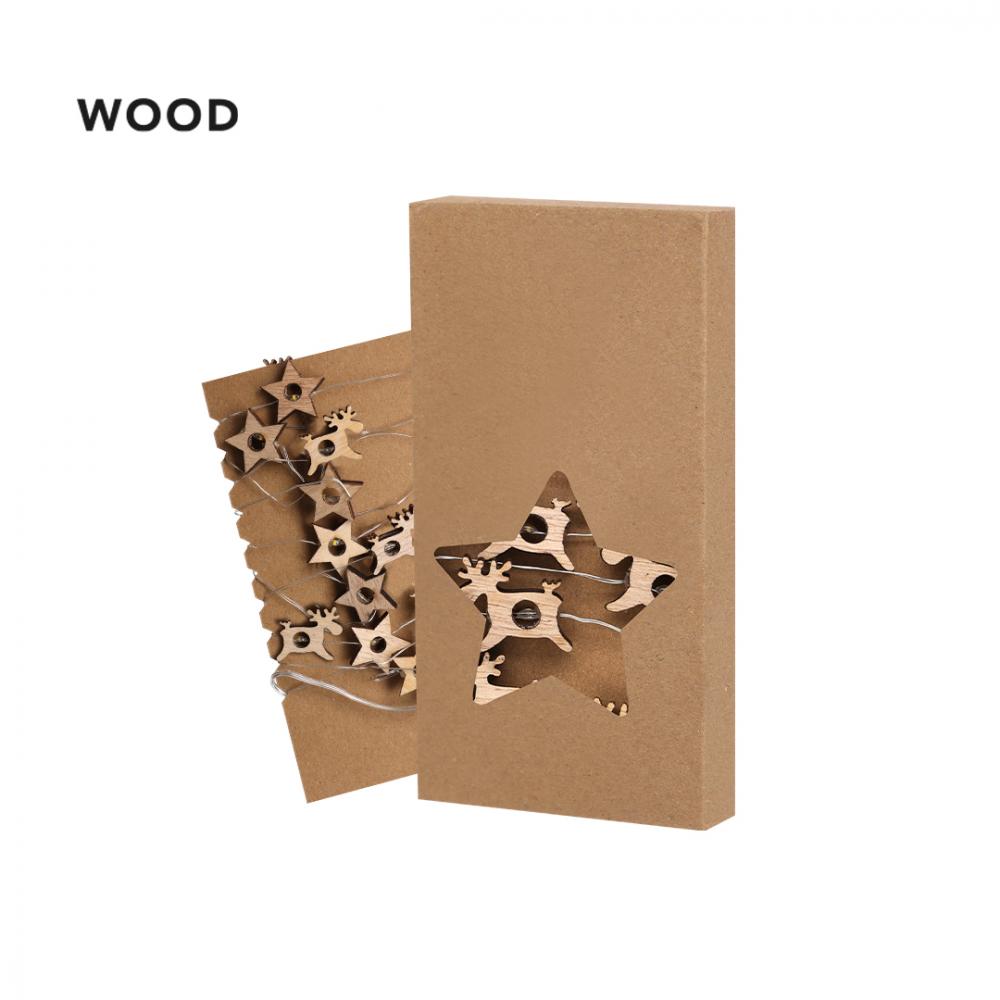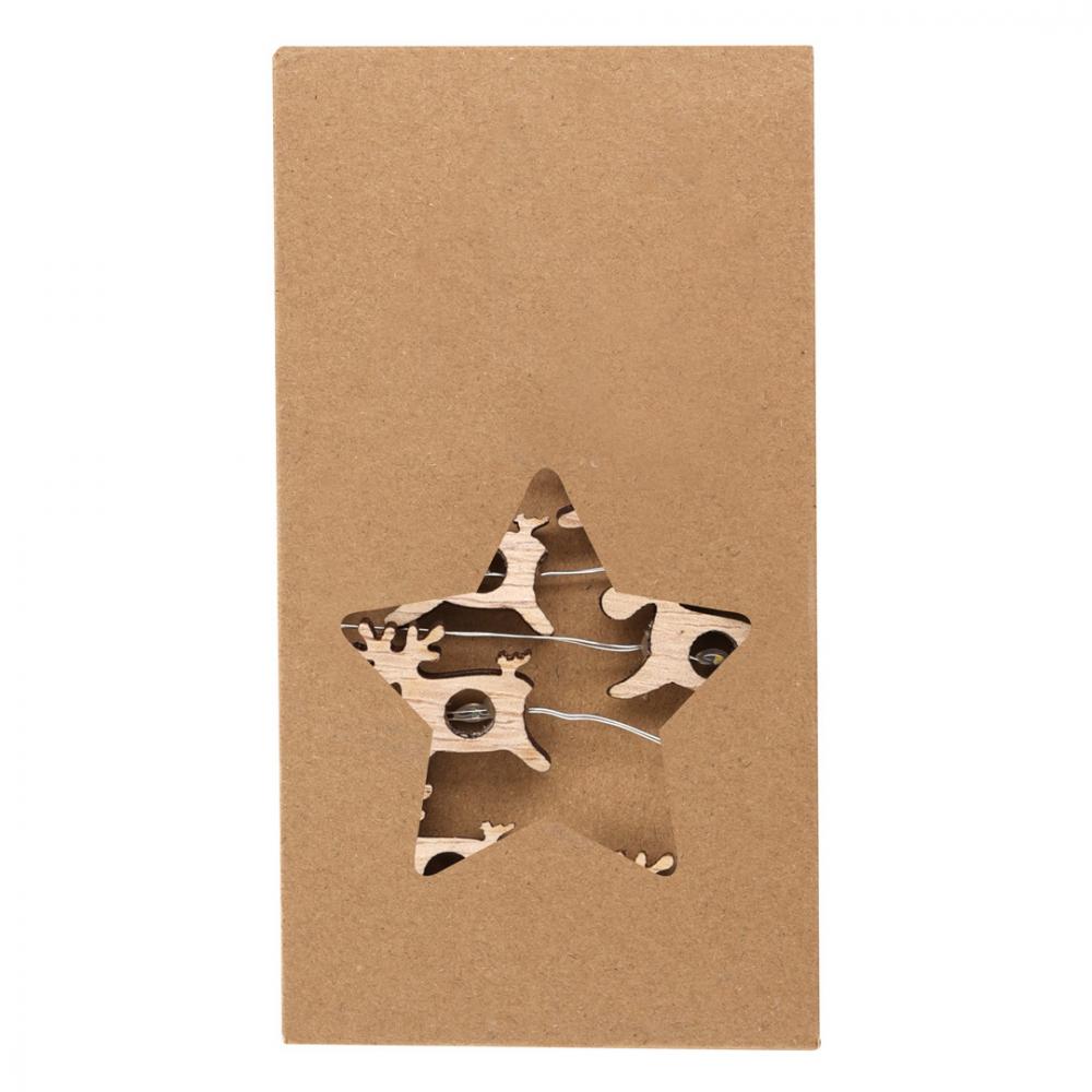 Гирлянда с подсветкой из натурального дерева. Оригинальный декоративный аксессуар с орнаментами из натуральных материалов, сочетающий в себе формы звезды и северного оленя. С 20 теплыми светодиодами. Питание от аккумулятора (2xAA в комплект не входят). Представлен в привлекательной крафт-коробке с высечкой в форме звезды.