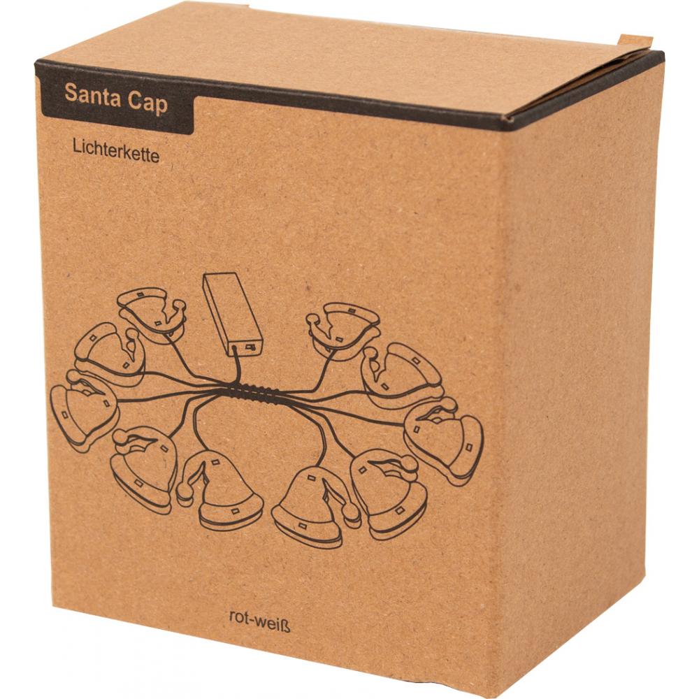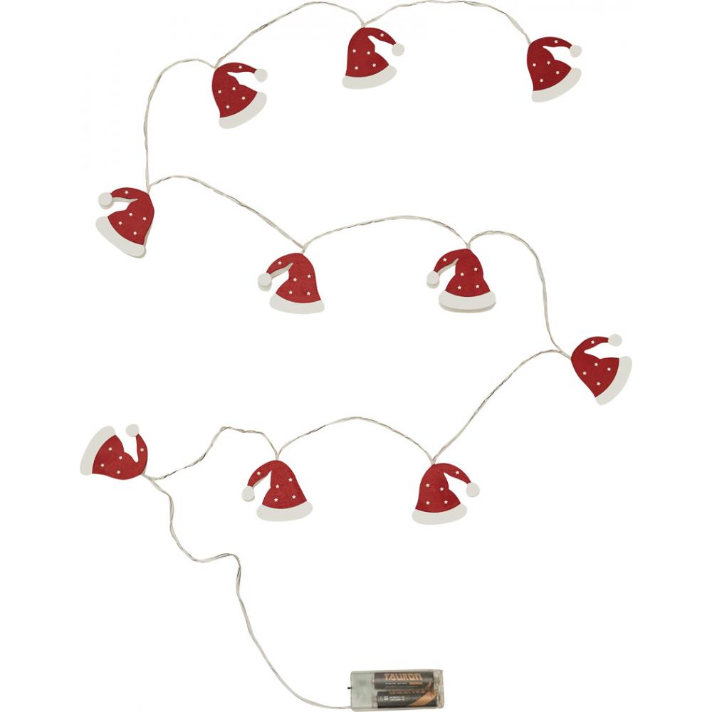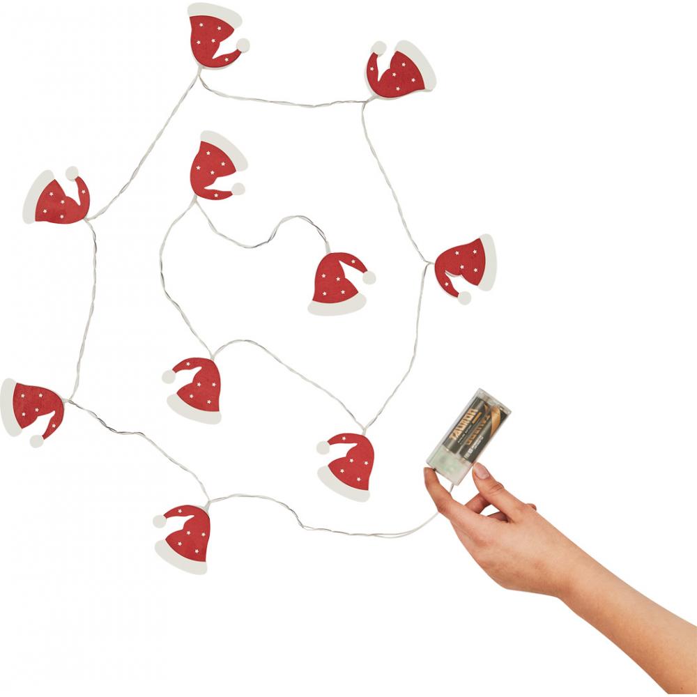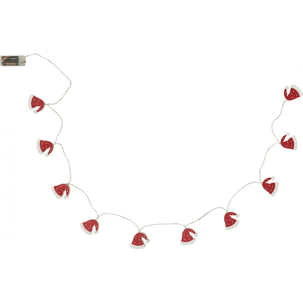 Шапочка Санта-Клауса на легкой гирлянде: длина около 168 см, каждая из 10 деревянных шапочек Санта-Клауса подсвечивается теплым белым светодиодом, функция таймера (6 часов включена, 18 часов выключена), работает от батареек (2 батарейки типа АА в комплект не входят).
