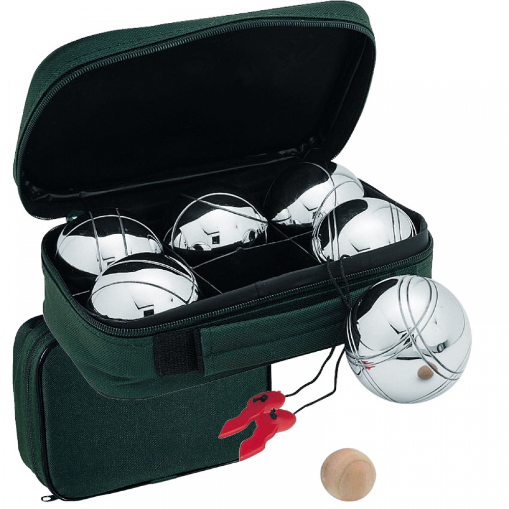 Игра в петанк для 3 человек, включает в себя шесть металлических шаров, маленький деревянный мяч и рулетку для измерения расстояния. Все расположено в чехол из полиэстера.
