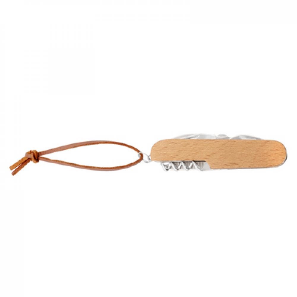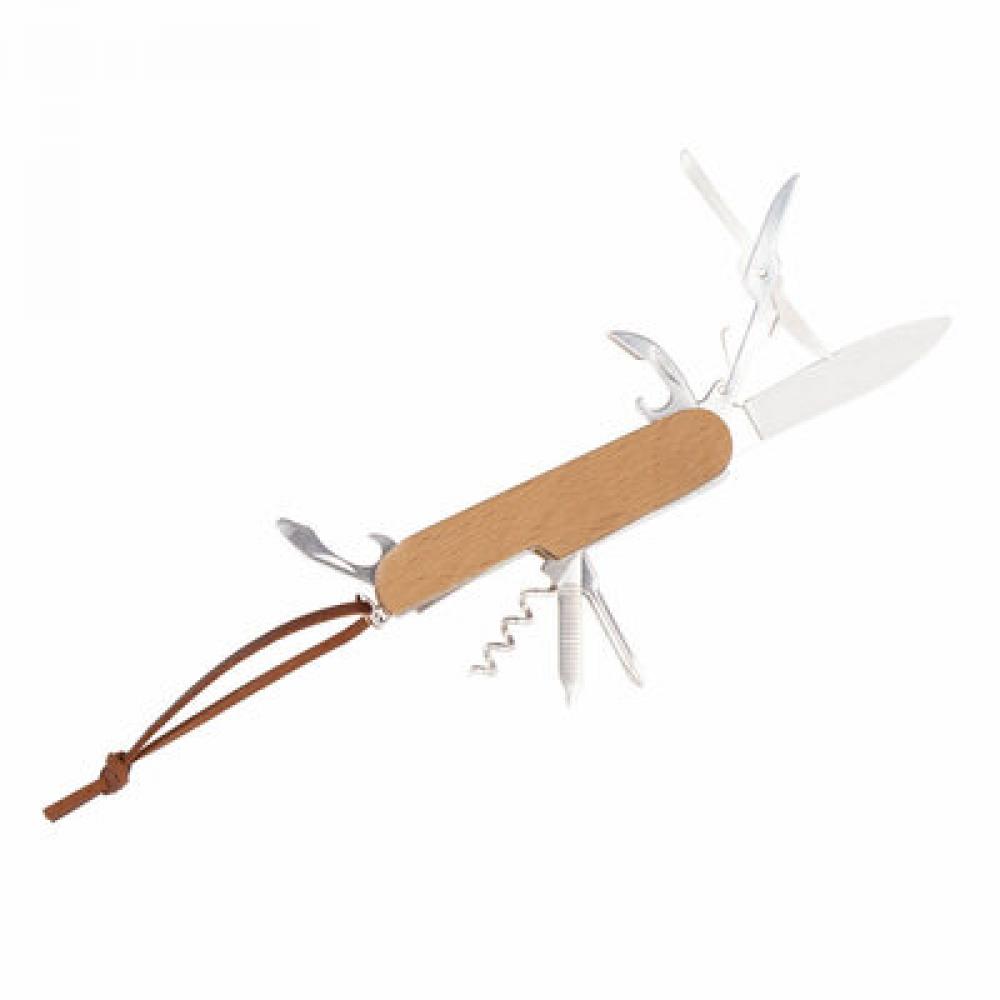 Многофункциональный инструмент, складной нож, с рукояткой из бука, 7 функций: нож, ножницы, открывалка для бутылок, штопор, пилка, отвертка, открывалка для консервных банок.