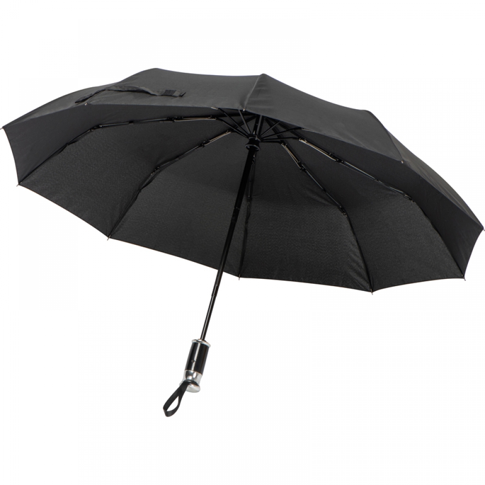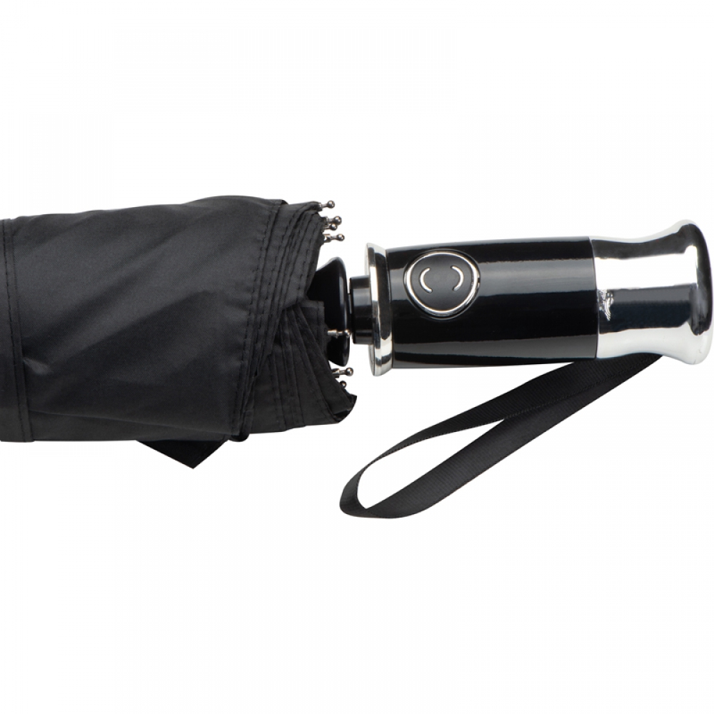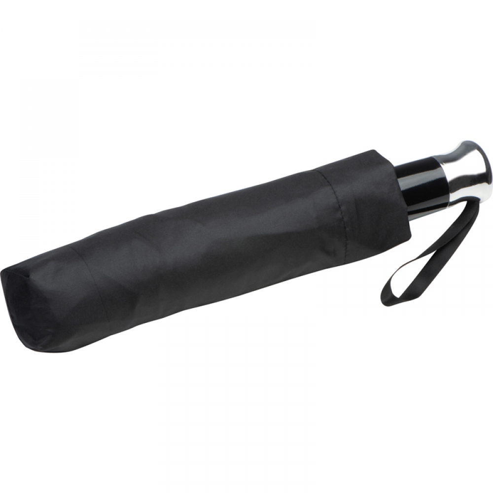 Высококачественный карманный зонт из понжевой ткани 190T с черным стеклопластиковым стержнем, элегантной ручкой и чехлом в тон. Автоматическое открытие и закрытие нажатием кнопки.