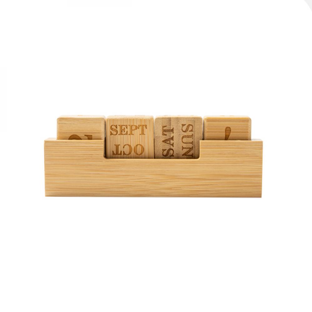 Вечный настольный календарь из бамбука, состоящий из одной подставки и четырех гравированных блоков.