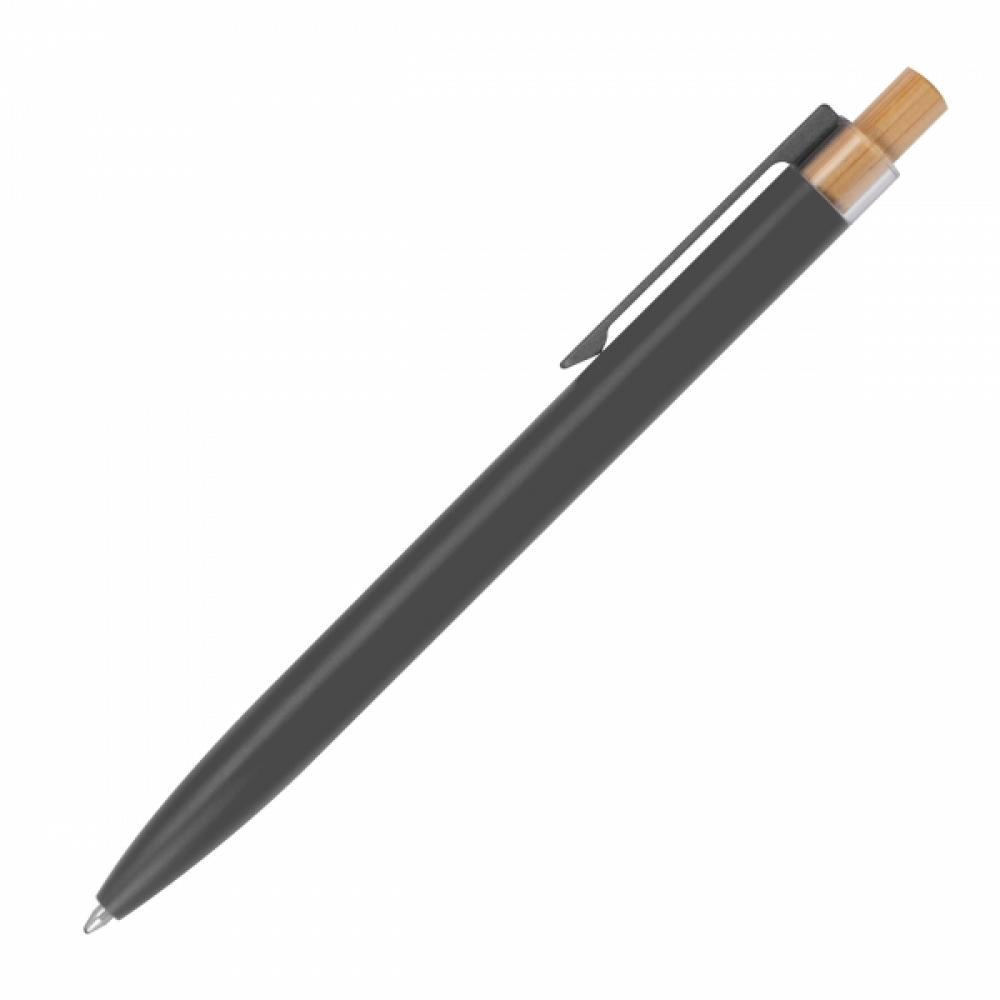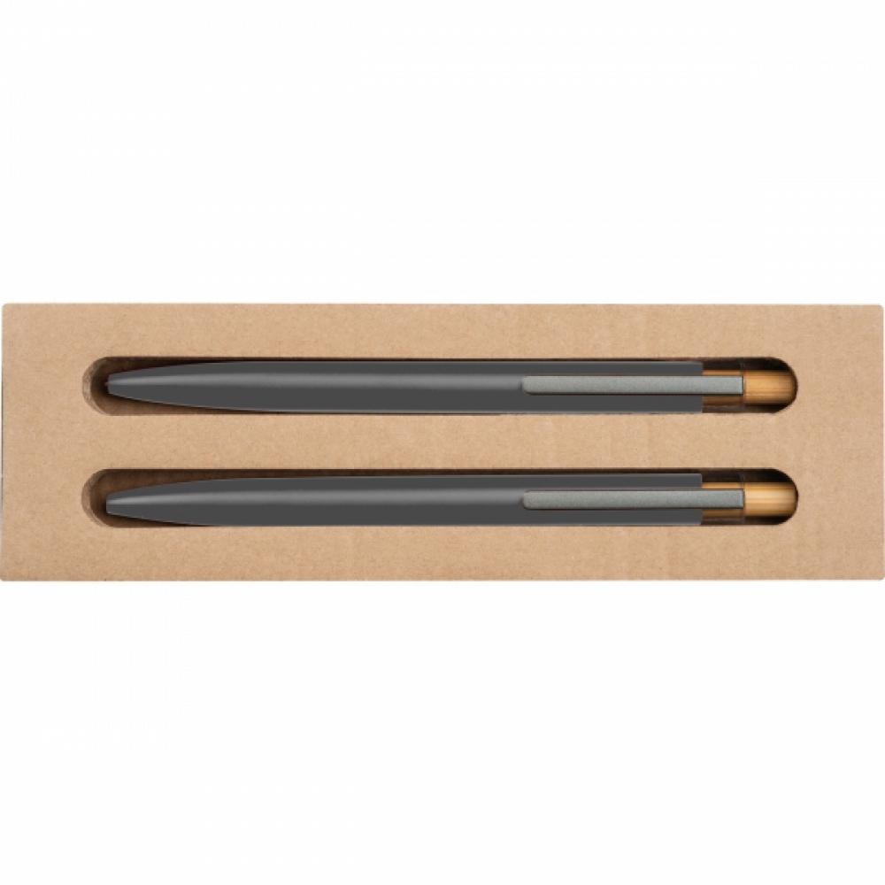 Набор для письма, состоящий из ручки с полугелевой синей пастой и механического карандаша, изготовленных из переработанного алюминия, с металлической клипсой и бамбуковым толкателем, в экологичной упаковке.
